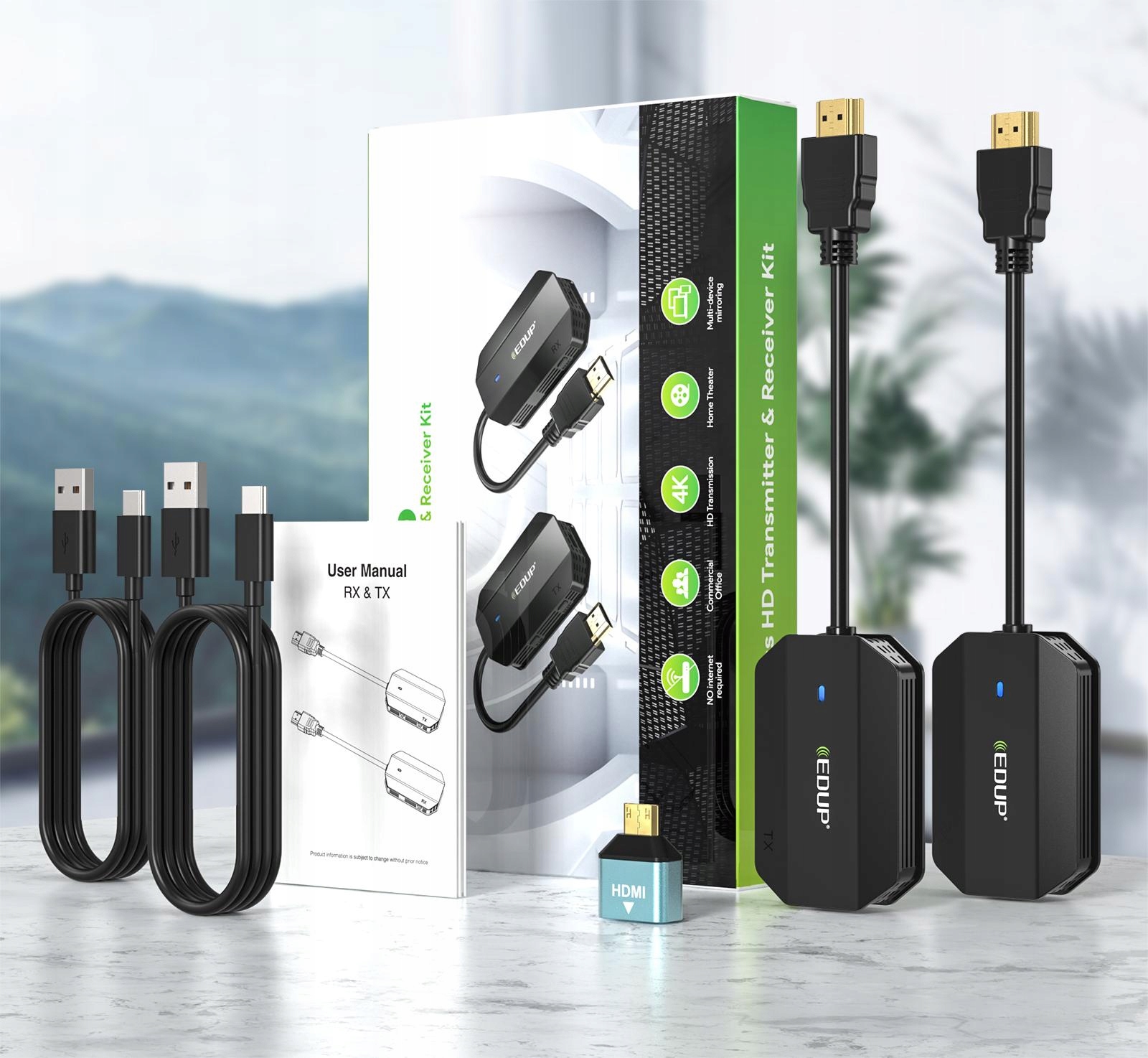 Беспроводной передатчик и приемник HDMI EDUP с дальностью передачи 164 фута/50 м, комплектом удлинителя HDMI 1080P, функцией Plug and Play для потоковой передачи видео/аудио с ноутбука/камеры/телефона на монитор/проектор/телевизор высокой четкости