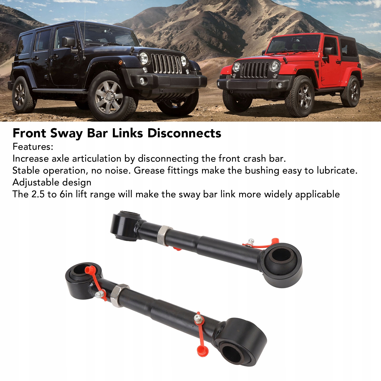 1. Установка: подходит JK Wrangler All 2007-2018 2 двери 4 двери; Следует помнить, что передние стабилизаторные распределения доступны в версиях 2030 и 2034 года. Помните эту версию при замене. Функция: Увеличение качания оси, бросив передний бампер. Стабильная и уродливая работа. Смазочные материалы смазывают смазку рукава. Матч высочайшего качества: изготовлен из металлических материалов, которые обеспечивают продолжительность в различных сложных условиях. Протестировано много раз перед продажей, чтобы обеспечить производительность. Система быстрого перелома: помогает стабилизировать положение транспортного средства по сравнению с подвеской. Установлен в двух шасси и разорван с корпусом оси с помощью стержня в конце луча. Стальная конструкция Spring Steel работает как стержень черепахи и предотвращает корпус, который он наклоняет во время скручивания. Регулируемая конструкция: подъемник от 2,5 до 6 дюймов означает, что дилатор стабилизатора подходит для более широкого диапазона транспортных средств, увеличивая стабильность и управление транспортным средством
