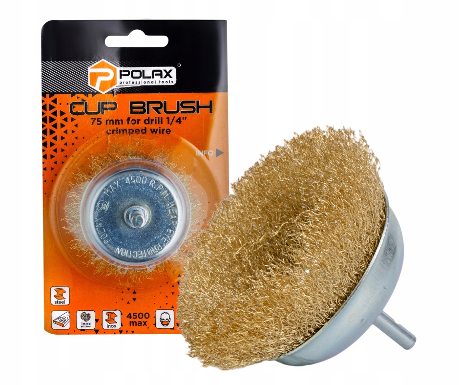 передняя щетка Polax можно использовать в наборе с любыми типами ручных и электрических сверл. предназначен для быстрой очистки металла и других поверхностей и элементов из старой краски, лака, коррозии, признаков естественного старения (патины), фундаментальных слоев, в том числе в твердых местах >