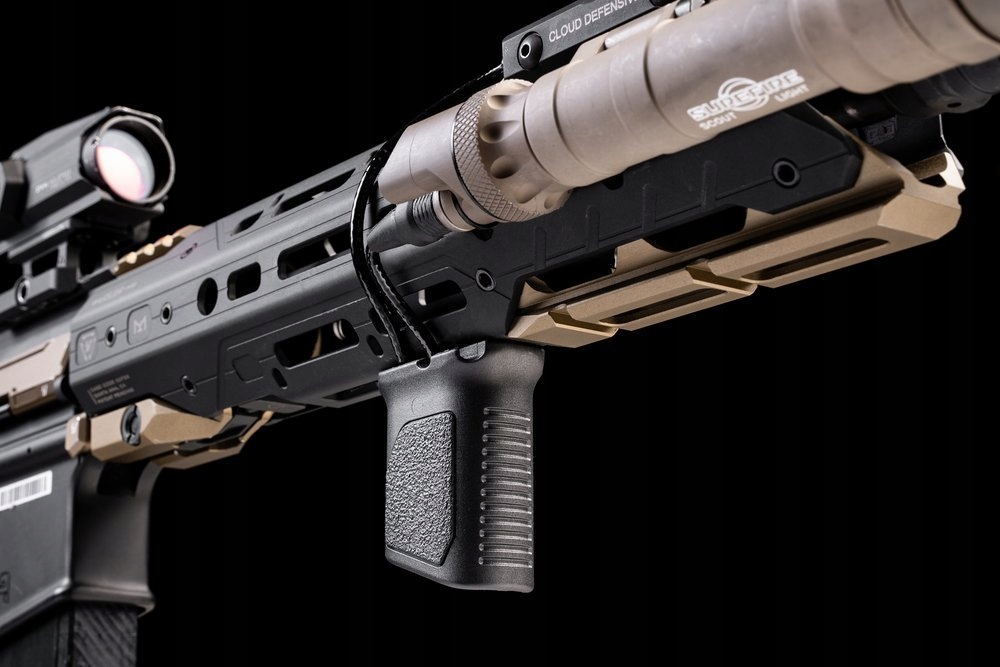 Передняя рукоятка для направляющих M-LOK и KeyMod изготовлена из прочного пластика, покрытого противоскользящей текстурой. Позволяет проложить внутри кабели тактического освещения или установить выключатель. Короткая версия с меньшим профилем. В цвете FDE.