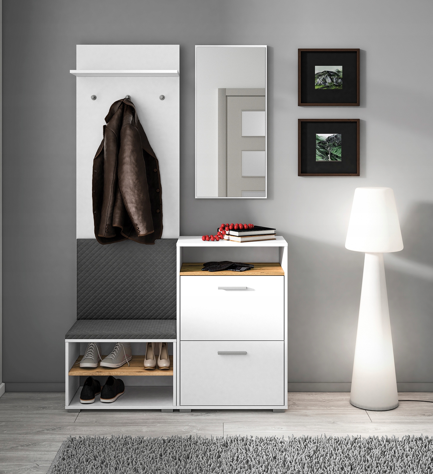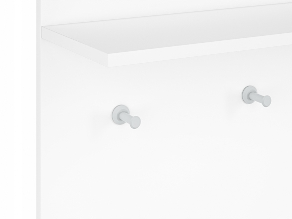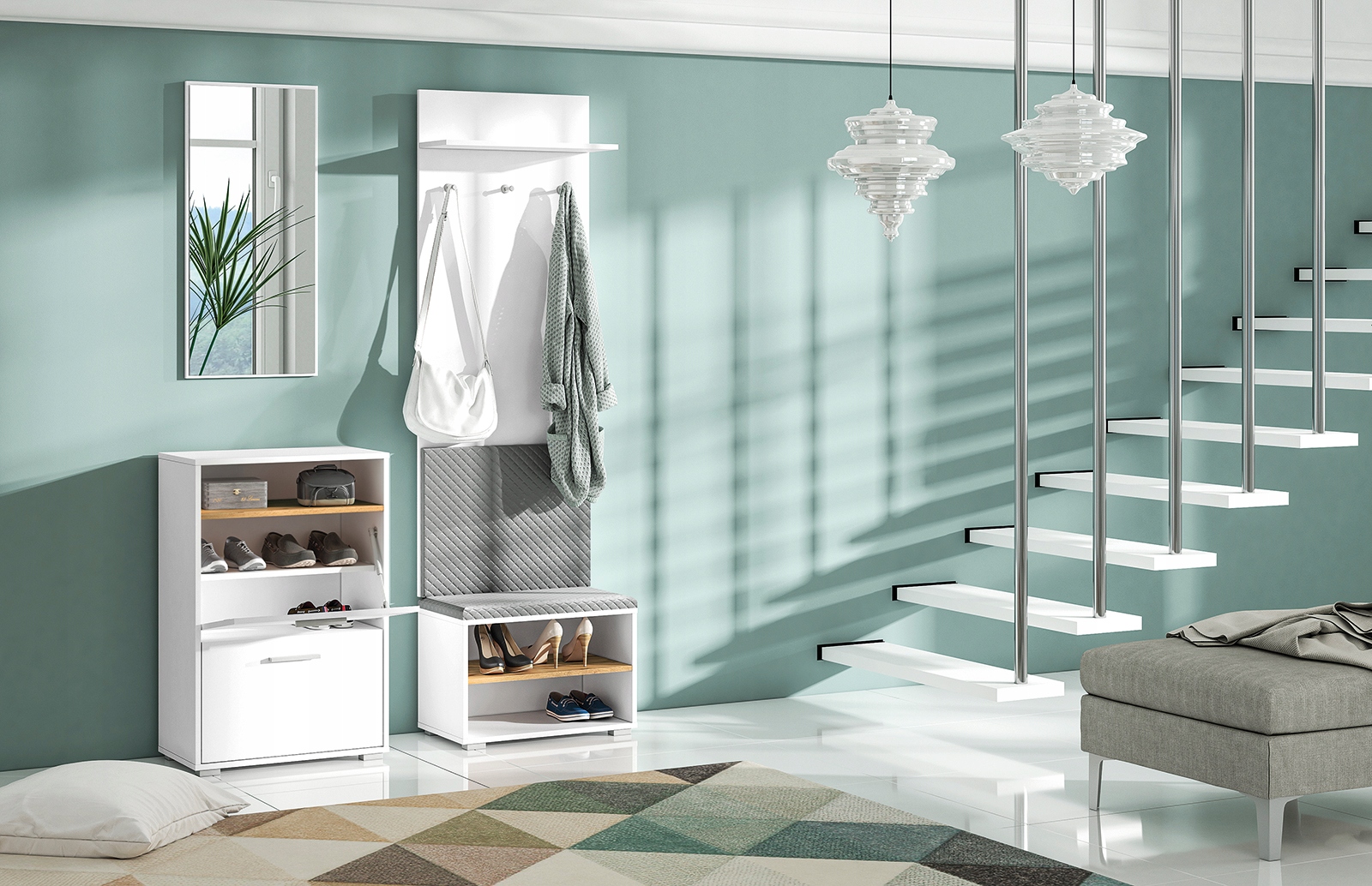 Прихожая ЛОРЭТ состоит из двухдверного обувного шкафа (всего внутри четыре полки для обуви), зеркала, панно с тремя вешалками и шкафа с мягким сиденьем. Под сиденьем имеется внутреннее пространство, разделенное симметрично пополам полкой. Предмет мебели идеально впишется в любую прихожую, отличается высоким качеством изготовления и функциональностью.