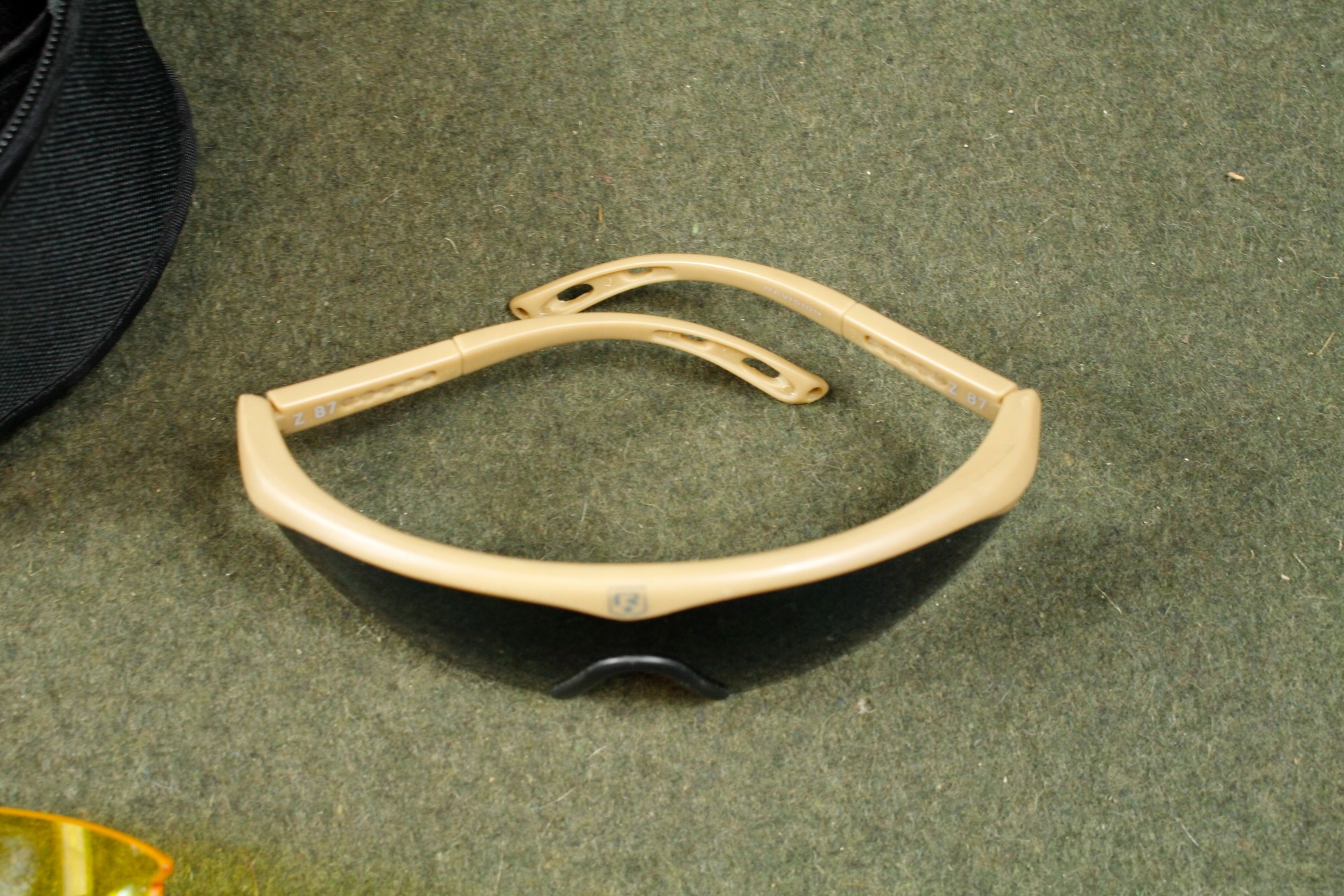Баллистические очки производства пересмотра американской компании. Оборудован с тонированным, прозрачным и желтым стеклом. Помещено в корпус пояса компании. У них есть регулируемые рамы,