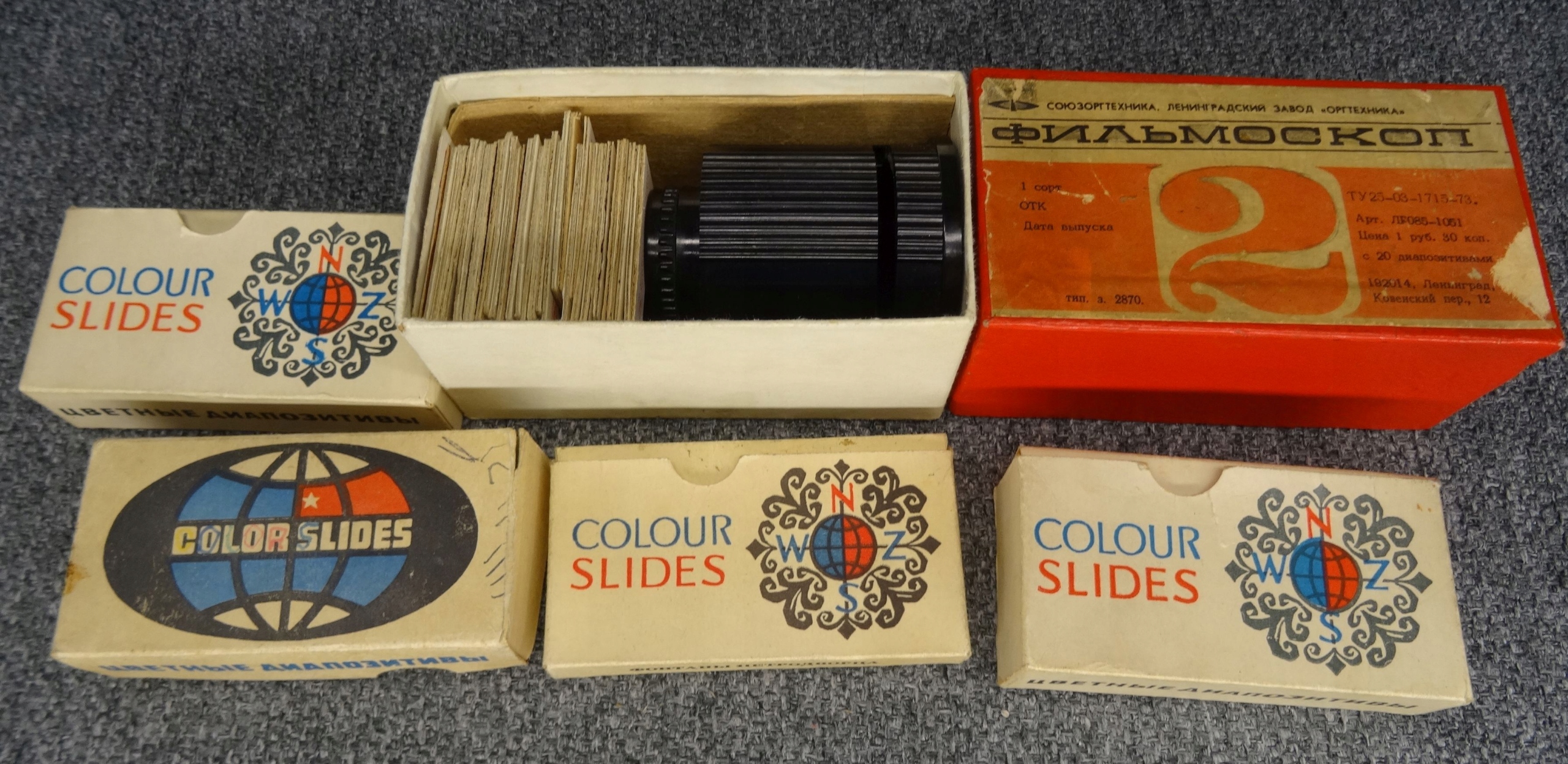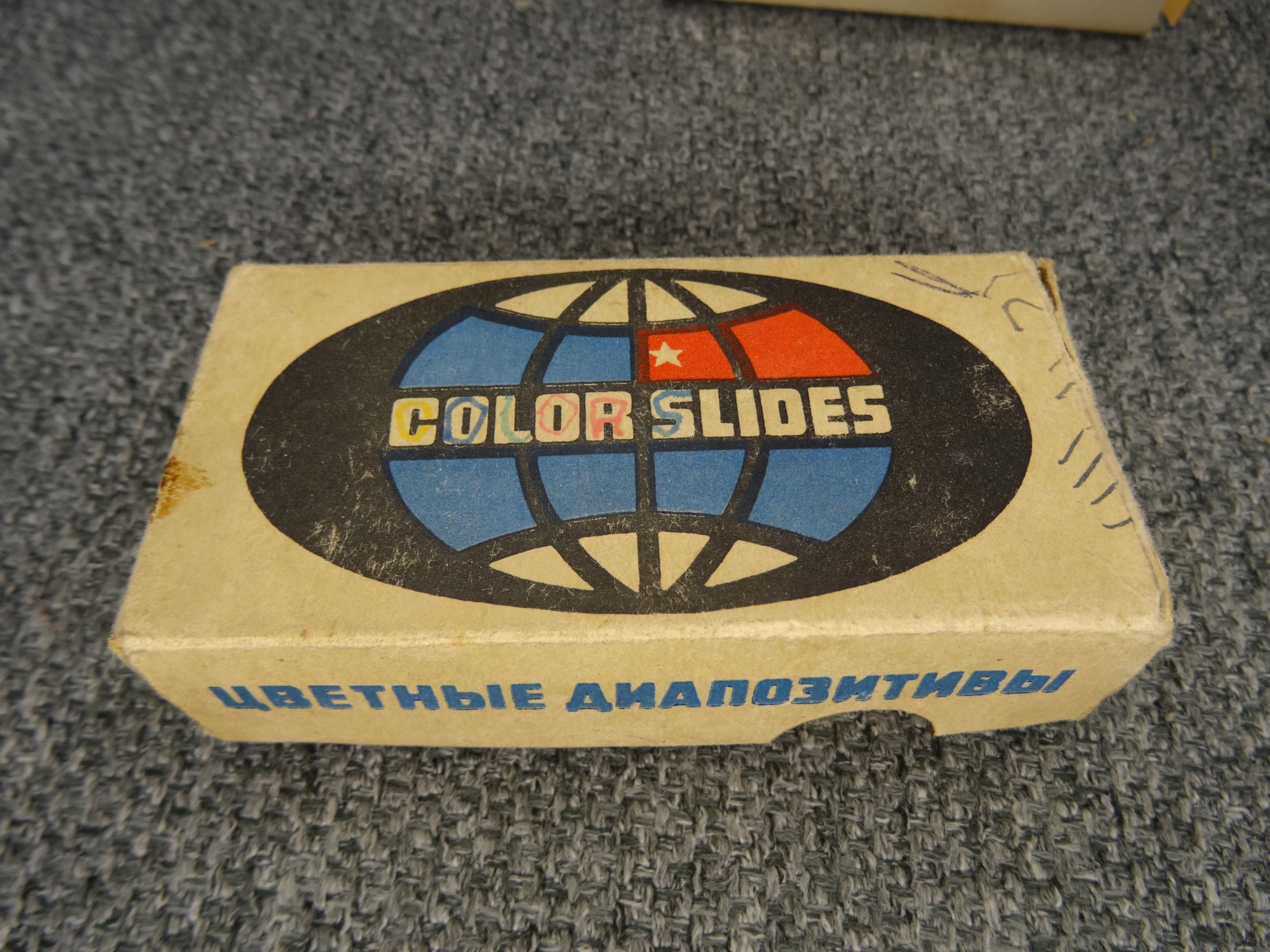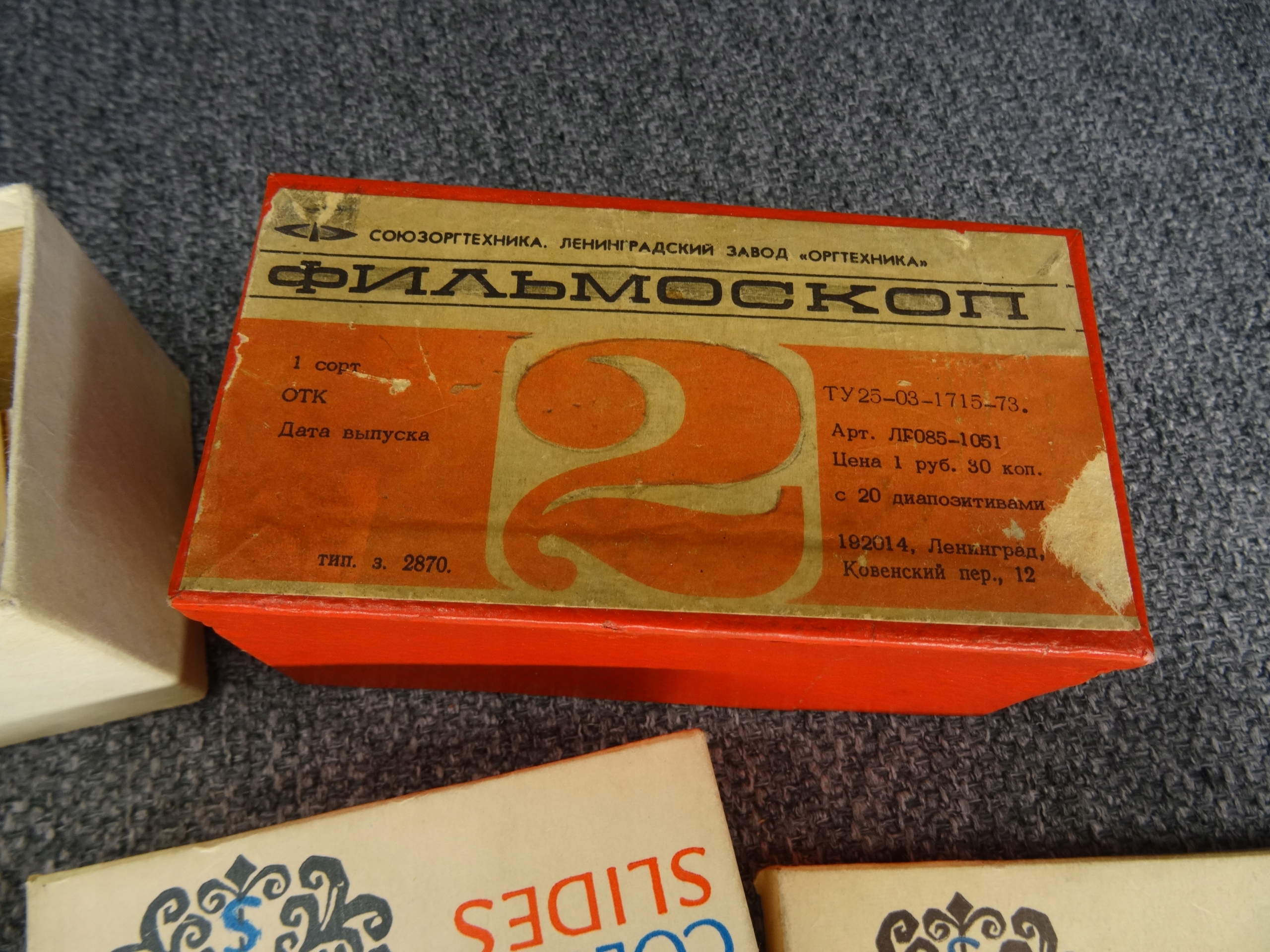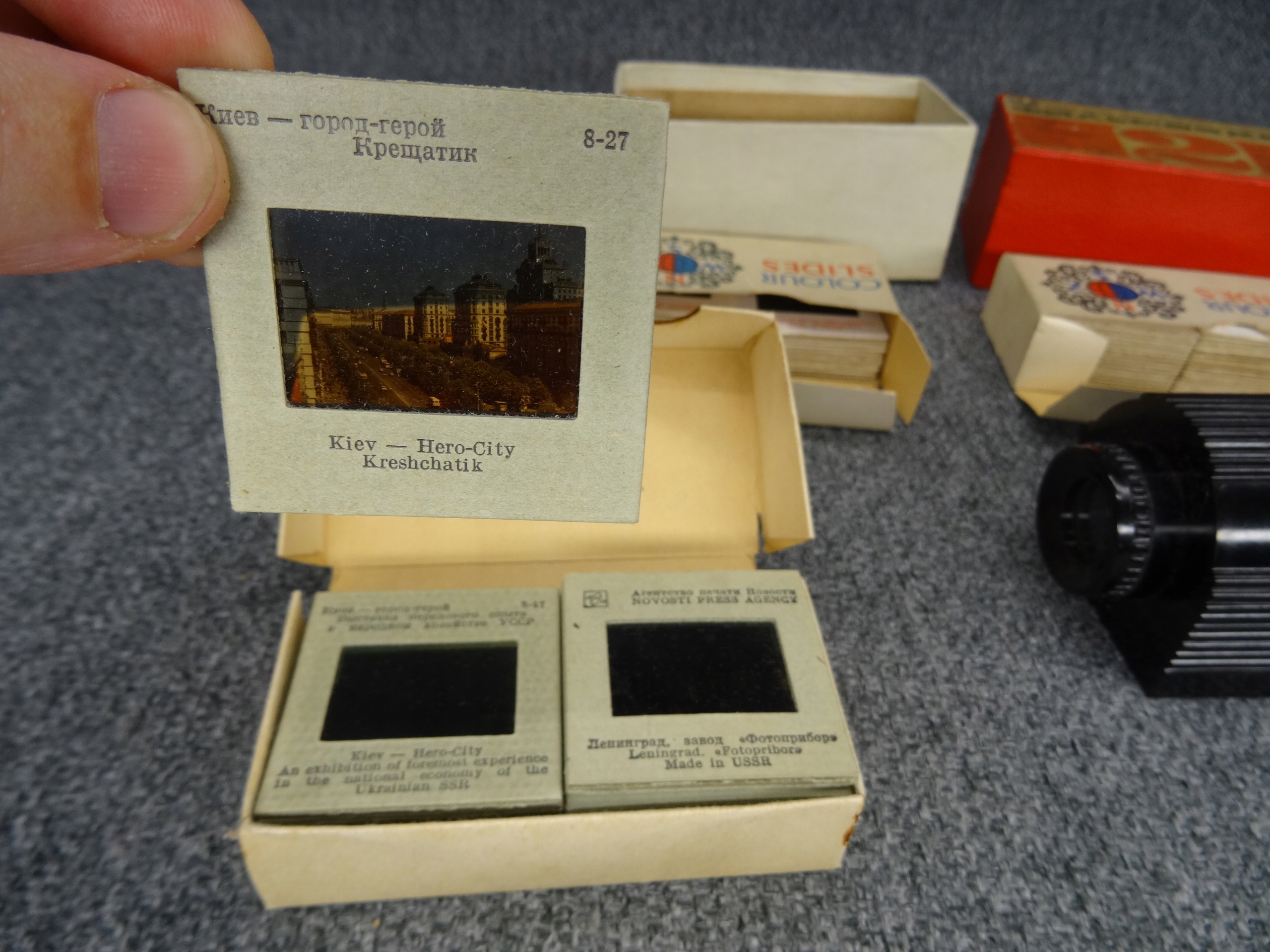 Ленинградский просмотрщик слайдов + большое количество красочных слайдов, упакованных в коробки. Тема городских памятников России