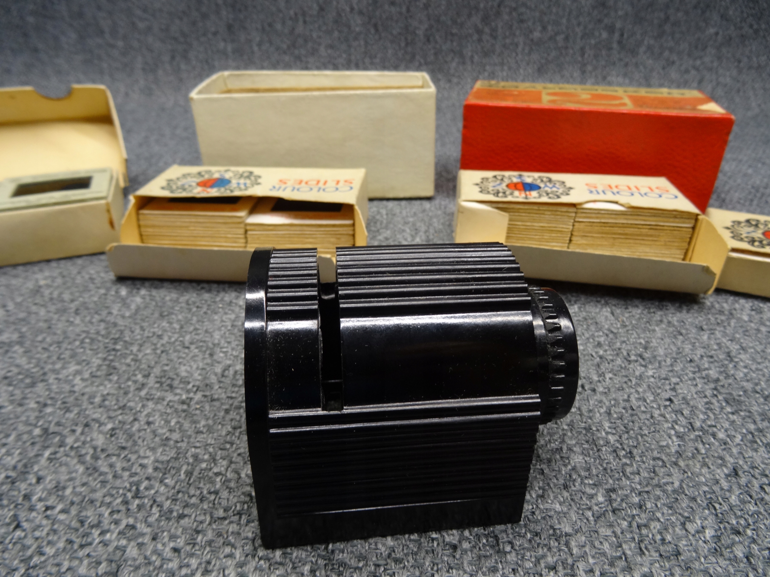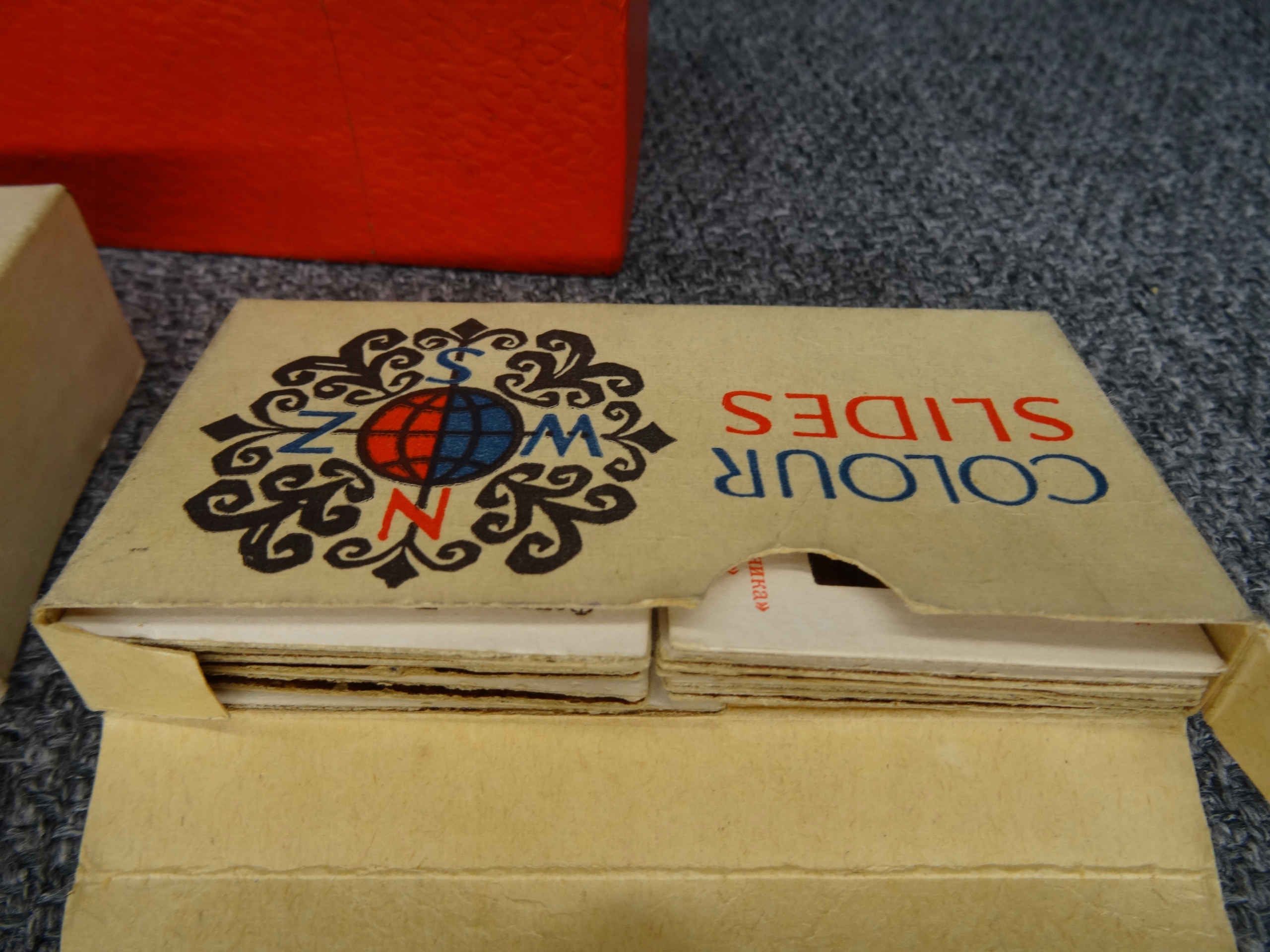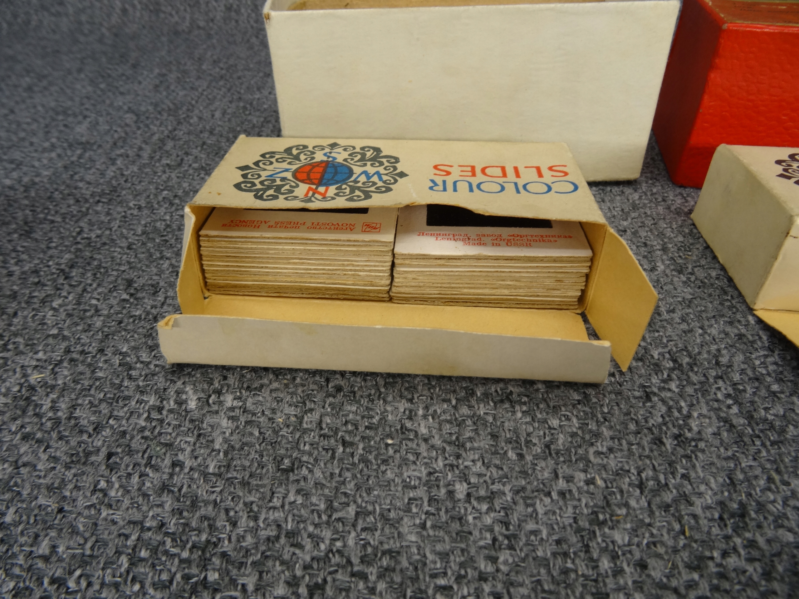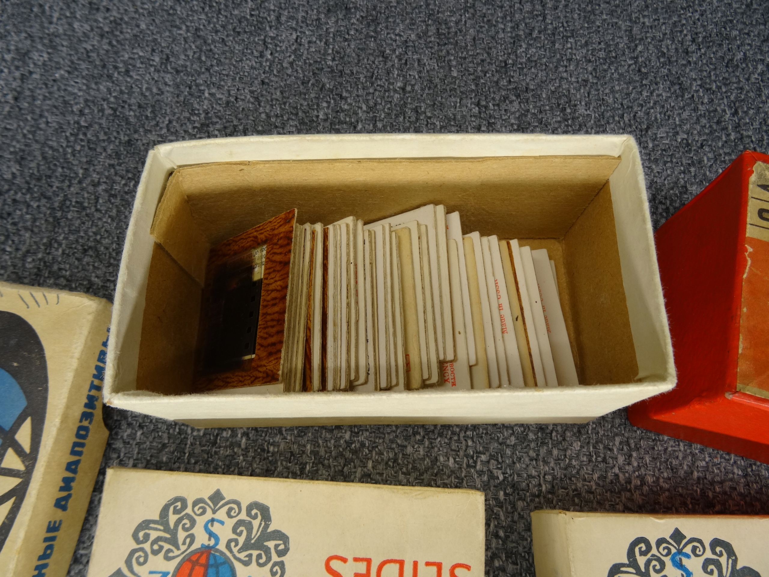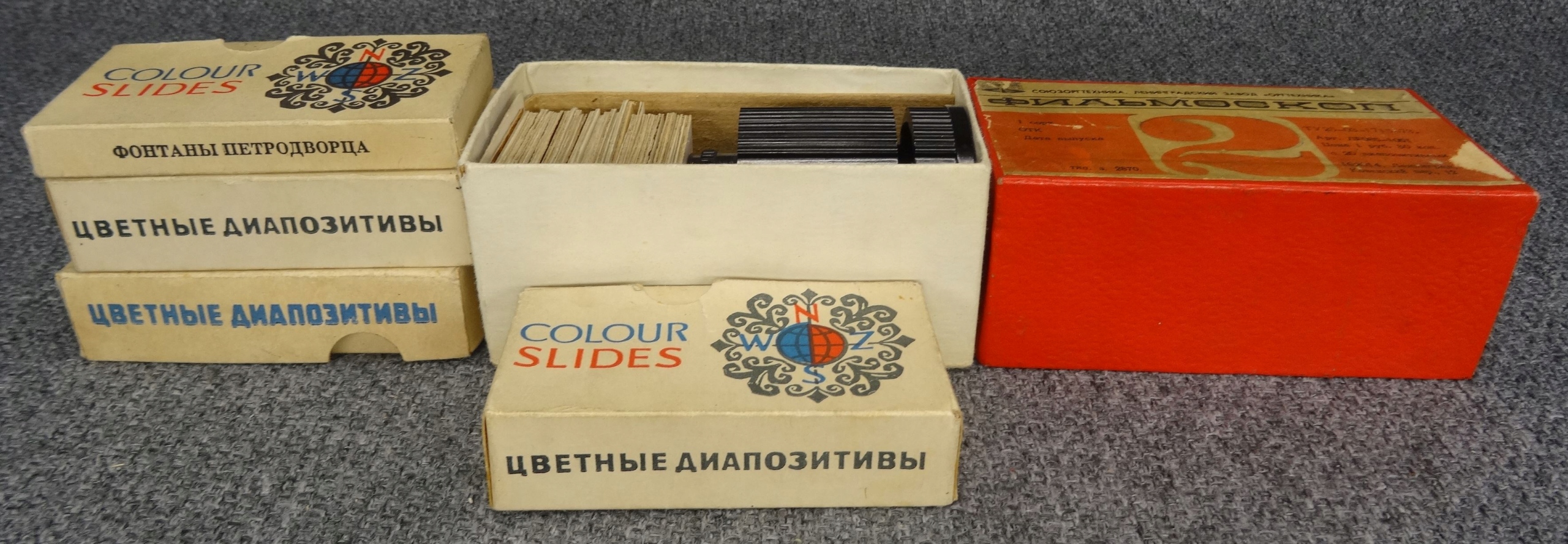 Ленинградский просмотрщик слайдов + большое количество красочных слайдов, упакованных в коробки. Тема городских памятников России