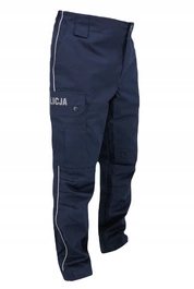 На передней части ног, покрывающих колено, есть усиленная часть ноги. карманы: два передних кармана размещенного косо. По бокам ног под наклонными карманами нанесены боковые карманы. На клапанах боковых карманов, изготовленных с использованием метода термонадрука, полиция надписи в серебристом отражающем цвете. В задней части два кармана, закрепленные порошком. Прямая муха скреплена кнопками.