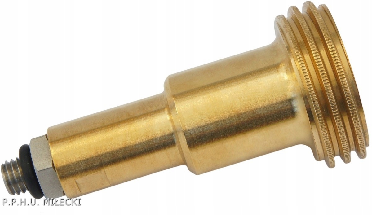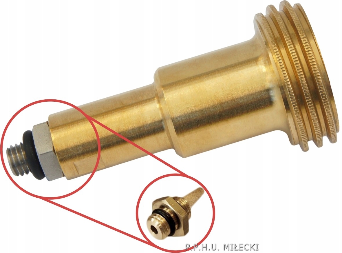 Латунный переходник для заправки с фильтрующим вкладышем из спеченной бронзы с размером пор 60 мкм (зерна диаметром 0,12-0,20 миллиметров), ввернутым в заливную горловину с резьбой М14, с другой стороны патрубок под итальянец ружье этого типа, используемое по всей Польше.