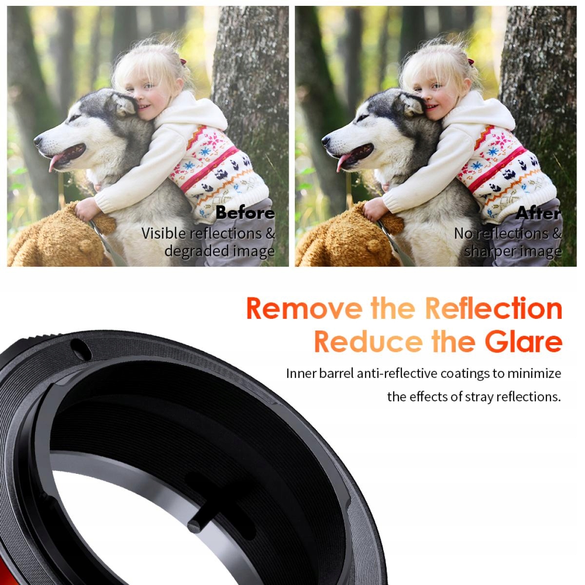 - Внутренняя часть адаптера имеет специальное матовое покрытие, которое минимизирует риск появления бликов и отражений. Что влияет на контрастность получаемого фото и резкость. Это иллюстрируют фотографии выше.