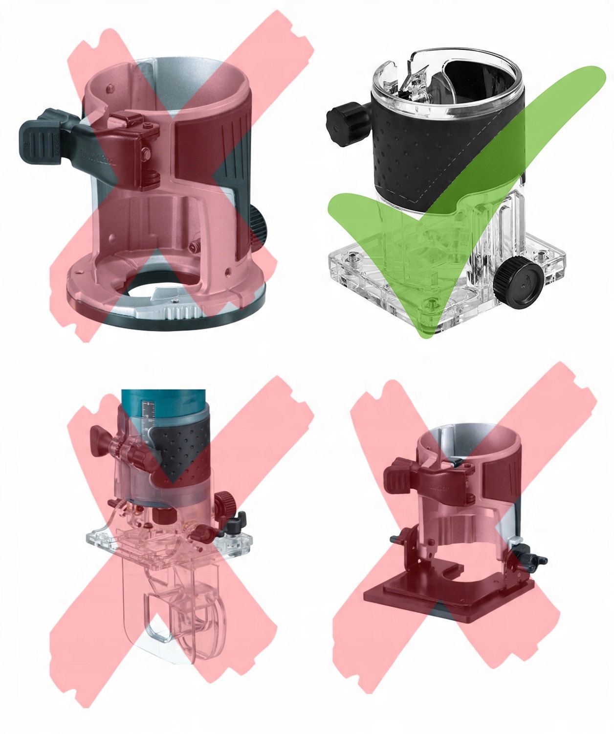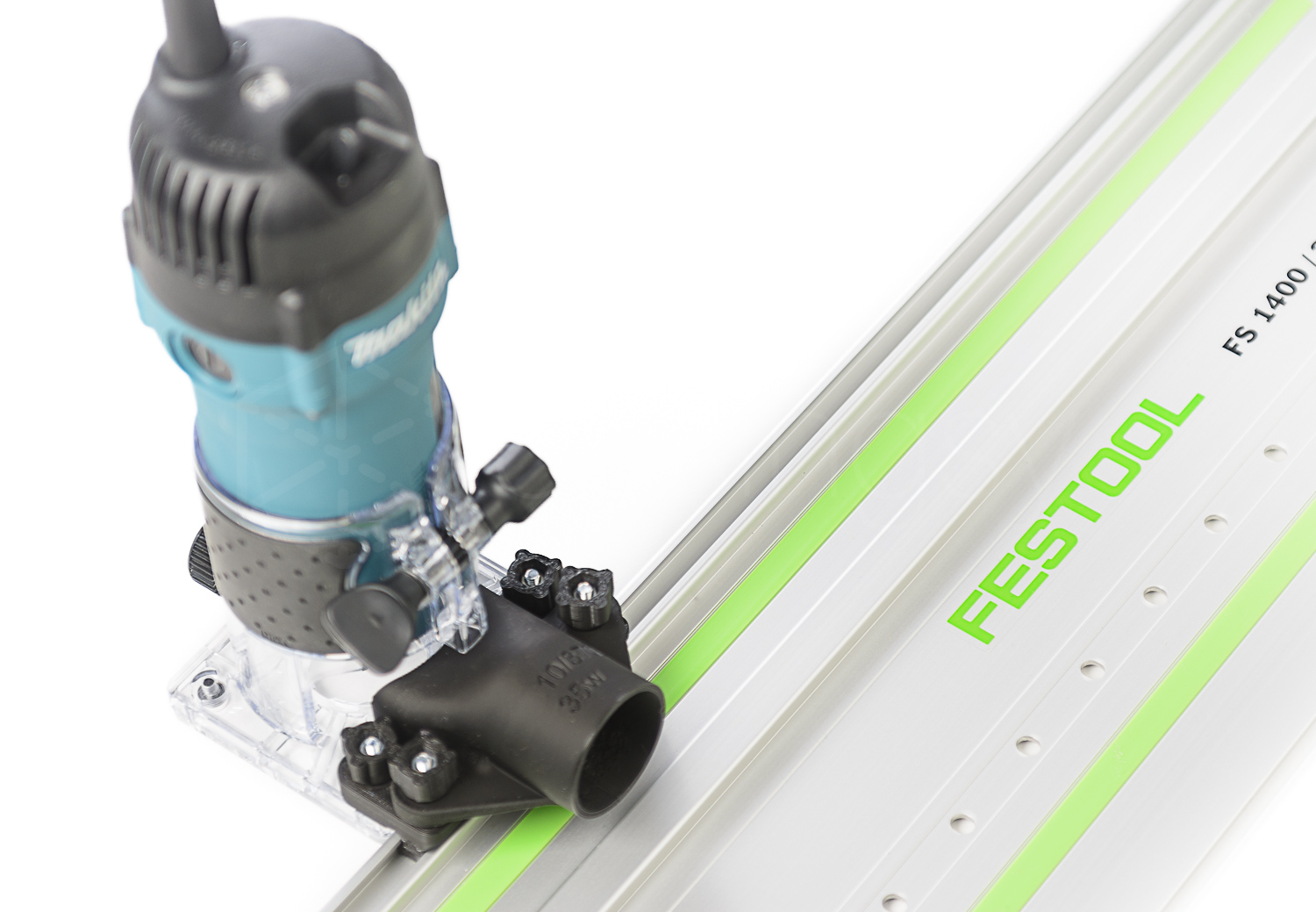 Адаптер позволяет надежно направлять фрезерный станок Makita 3711, установленный в стандартном держателе с прямоугольным основанием, по обозначенной направляющей.