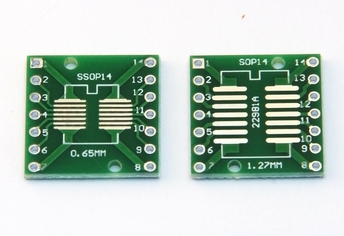 Adapter SO14 (SOP14) Растроф 1,27 мм, SSOP14 растровый 0,65 мм, DIP14W (широкое расстояние, расстояние 15,24 мм). Он сделан на двойном ламинате с металлизацией 1,5 мм отверстий FR4. Благодаря металлизации, пайки имеют гораздо большую механическую прочность, и нет никакой опасности их отряда.