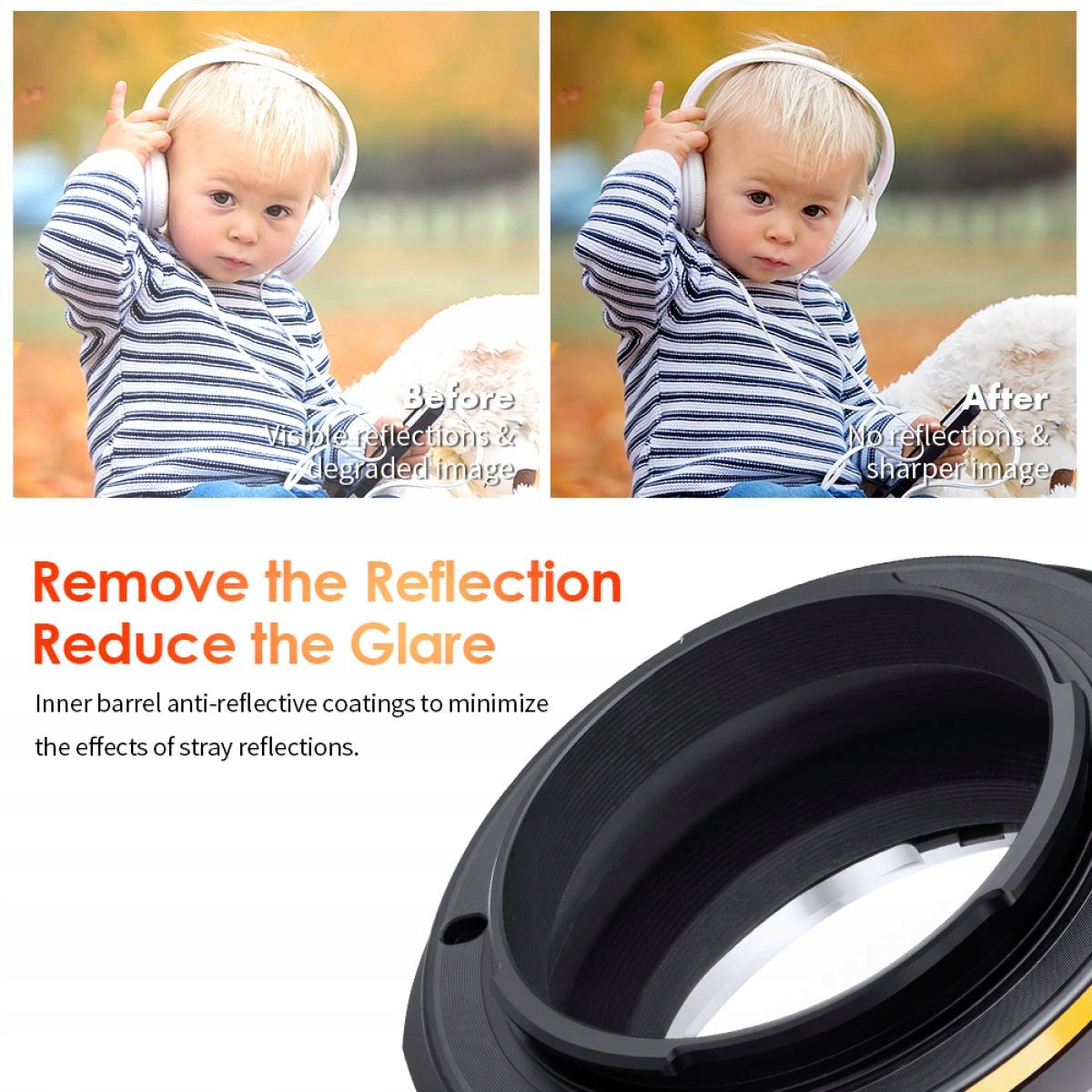 - Внутренняя часть адаптера имеет специальное матовое покрытие, которое минимизирует риск появления бликов и отражений. Что влияет на контрастность получаемого фото и резкость. Это иллюстрируют фотографии выше.