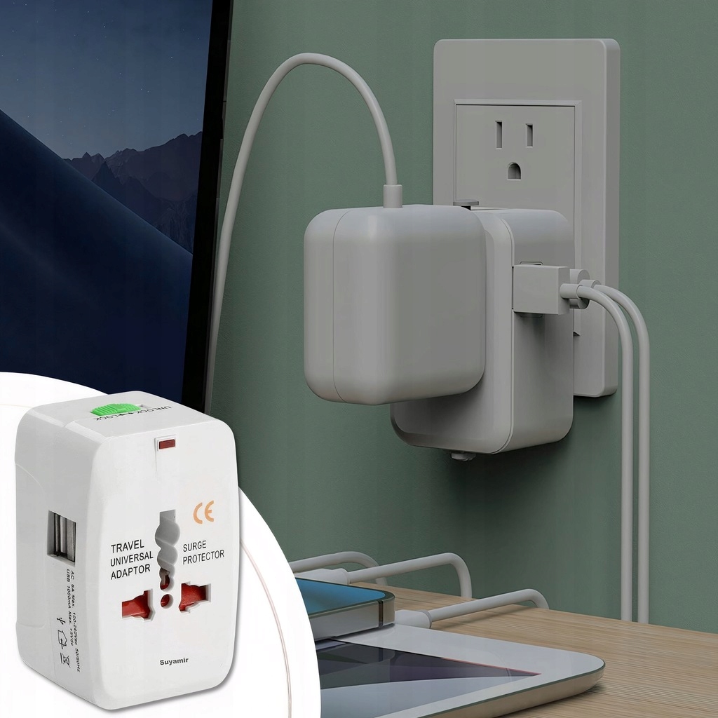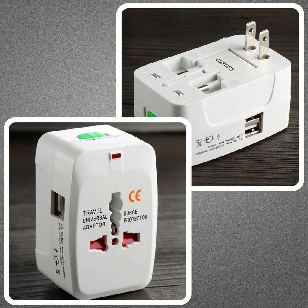 PRZEJŚCIÓWKA USA UK EU AUS ADAPTER SIECIOWY PODRÓŻNY + 2x USB