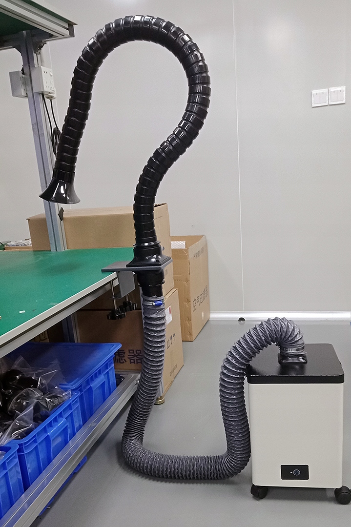 Один адаптер следует прикрепить к держателю стола (снизу), а другой – к абсорберу. На оба переходника следует установить гибкую трубу диаметром 75 мм с хомутом (труба и хомут в комплект поставки не входят). Оригинальную поглощающую трубку следует установить в верхней части настольного крепления. Ниже фото собранного набора.