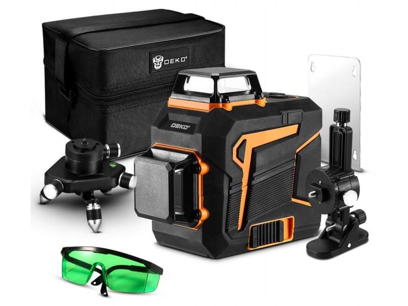 В комплект входит практичный кейс, в котором можно разместить элементы набора, лазерный уровень DEKO DKLL12PQ1, магнитное настенное крепление, руководство пользователя на польском языке, защитные очки, адаптер ¼ дюйма, аккумулятор, зарядное устройство, пластину, мини-штатив и пульт дистанционного управления.