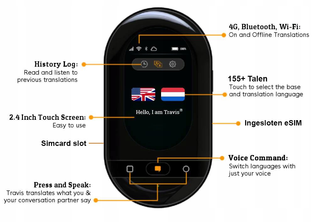 - Простота в использовании: большой сенсорный экран с диагональю 2,4 дюйма, на котором Трэвис также показывает письменные переводы.