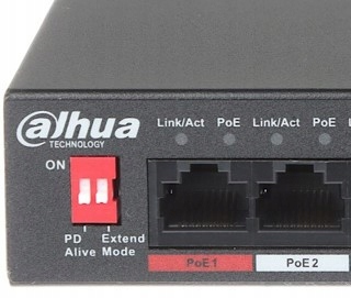 Коммутатор может работать в режиме расширения — благодаря этой функции мы можем добиться увеличения расстояния подачи питания и данных от портов PoE (максимум до 250 м со скоростью 10 Мбит/с). Кроме того, порт PoE 1, отмеченный красным, поддерживает стандарты IEEE802.3bt и Hi-PoE с максимальным энергопотреблением до 60 Вт.