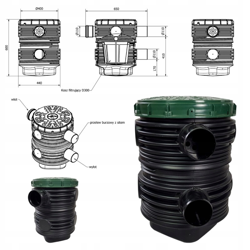 Переливной фильтр изготовлен из полиэтилена высокой плотности PEHD. Корпус и крышка изготовлены методом литья пластмассы. Соединения фильтраинтегрированы в корпус. Фильтр оснащен входом, ливневым переливом с сетчатым фильтром и выходом. Ливневой перелив служит аварийным отводом воды из фильтра в случае засорения фильтрующей корзины.