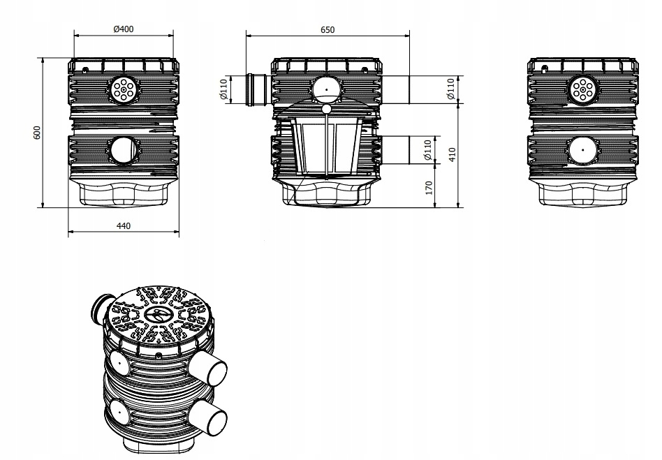 Все соединения имеют диаметр Ø110 мм. Компактная конструкция фильтра защищает его от повреждений. Завинчивающаяся крышка облегчает обслуживание.