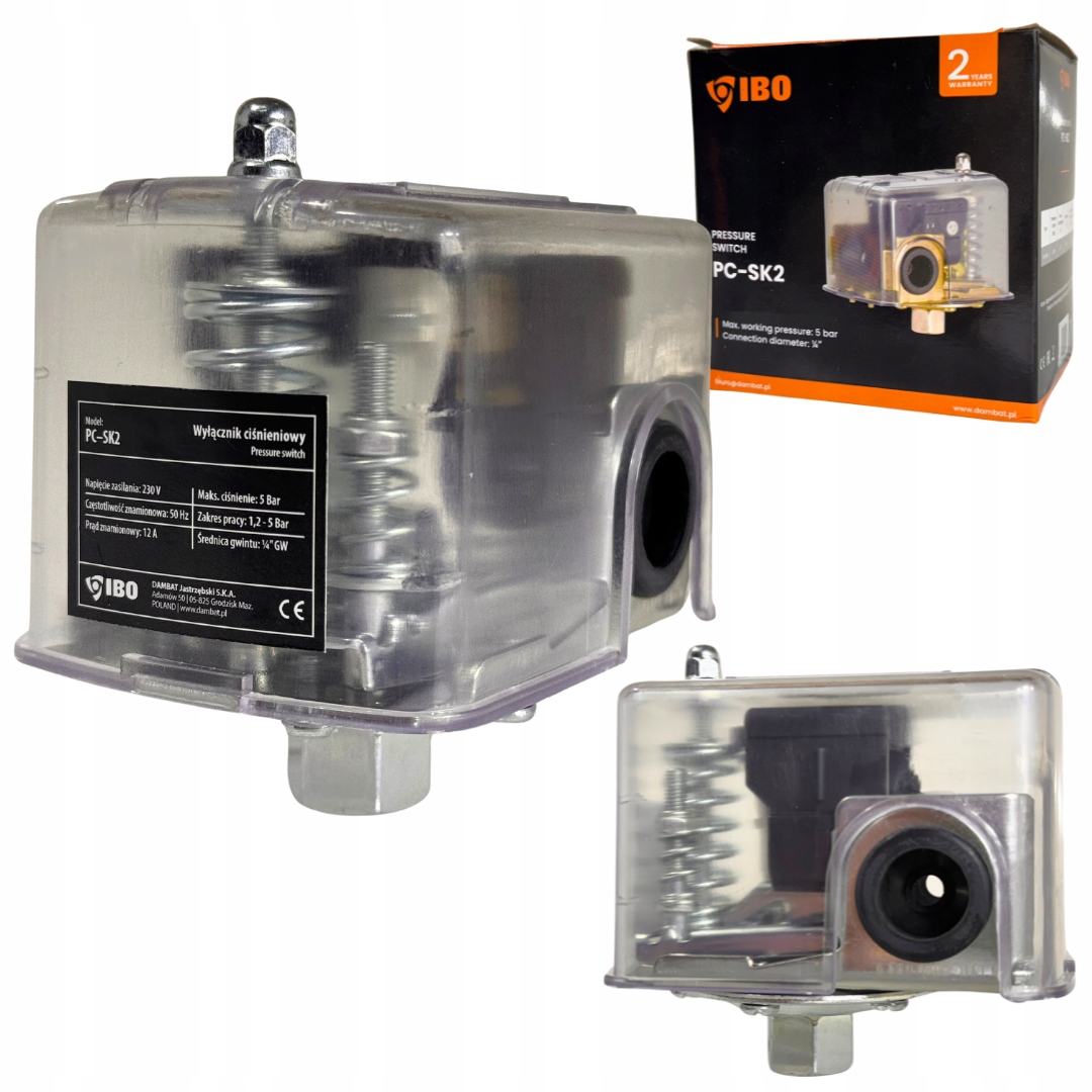 ПЕРЕКЛЮЧАТЕЛЬ, РЕЛЕ ДАВЛЕНИЯ НАСОСА, ПОВОРОТНОЕ СОЕДИНЕНИЕ 1/4" 230 В, ПРОЗРАЧНЫЙ КОРПУС, IBO PC-SK2