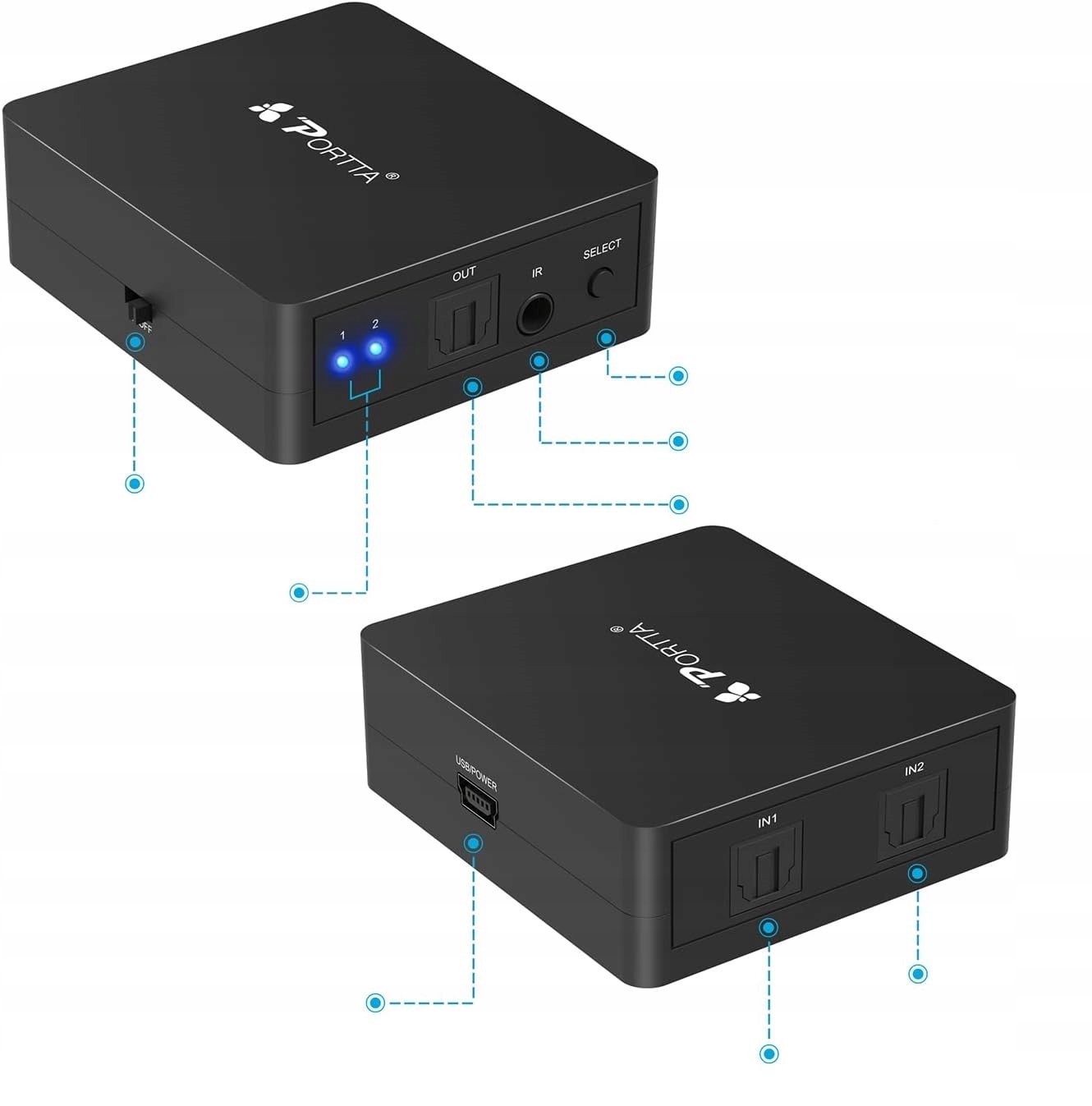 - 【Содержимое упаковки】 Переключатель Toslink Portta 2x1 _ x1, источник питания USB x1, пульт дистанционного управления x1, приемник ИК-удлинителя x1,