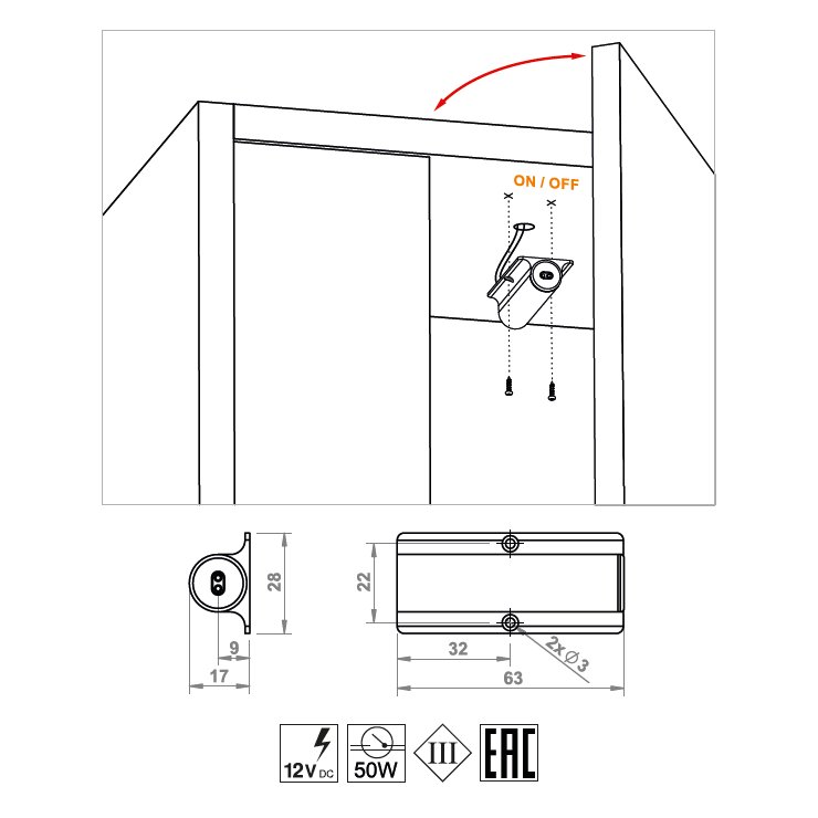 Устройство включает освещение при открытии дверцы шкафа и выключает его при закрытии дверцы.