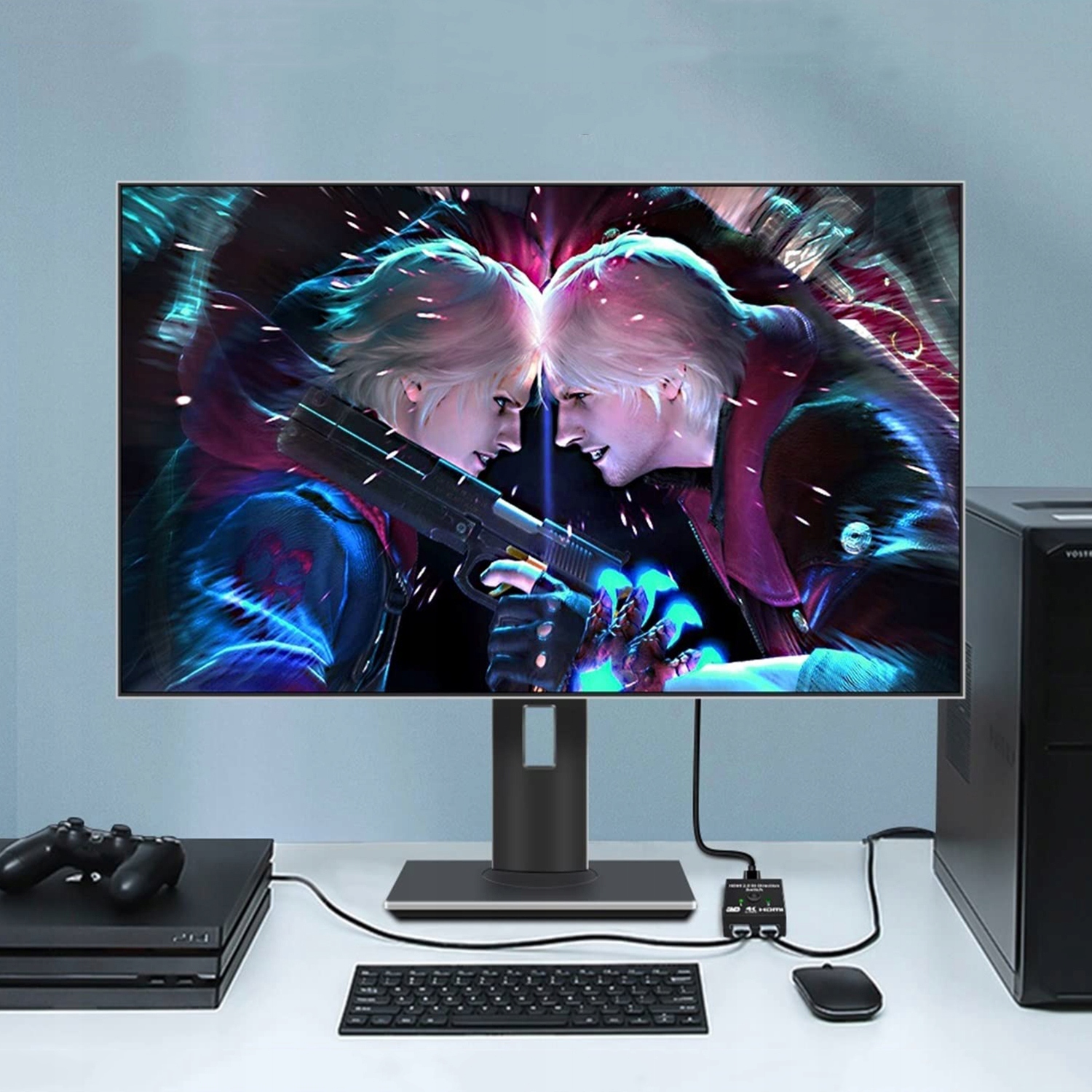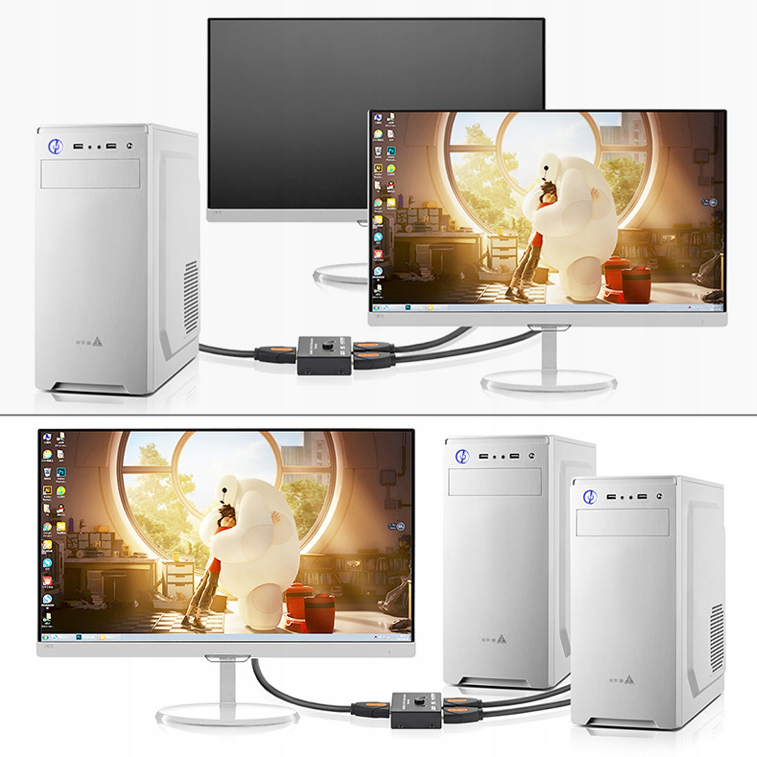 В режиме переключения (действует как переключатель HDMI) предлагает 2 входа HDMI для подключения к 1 дисплею HDMI. Вы можете переключаться между ними, чтобы избежать повреждения дисплея HDMI, вызванного подключением и отключением кабеля HDMI.