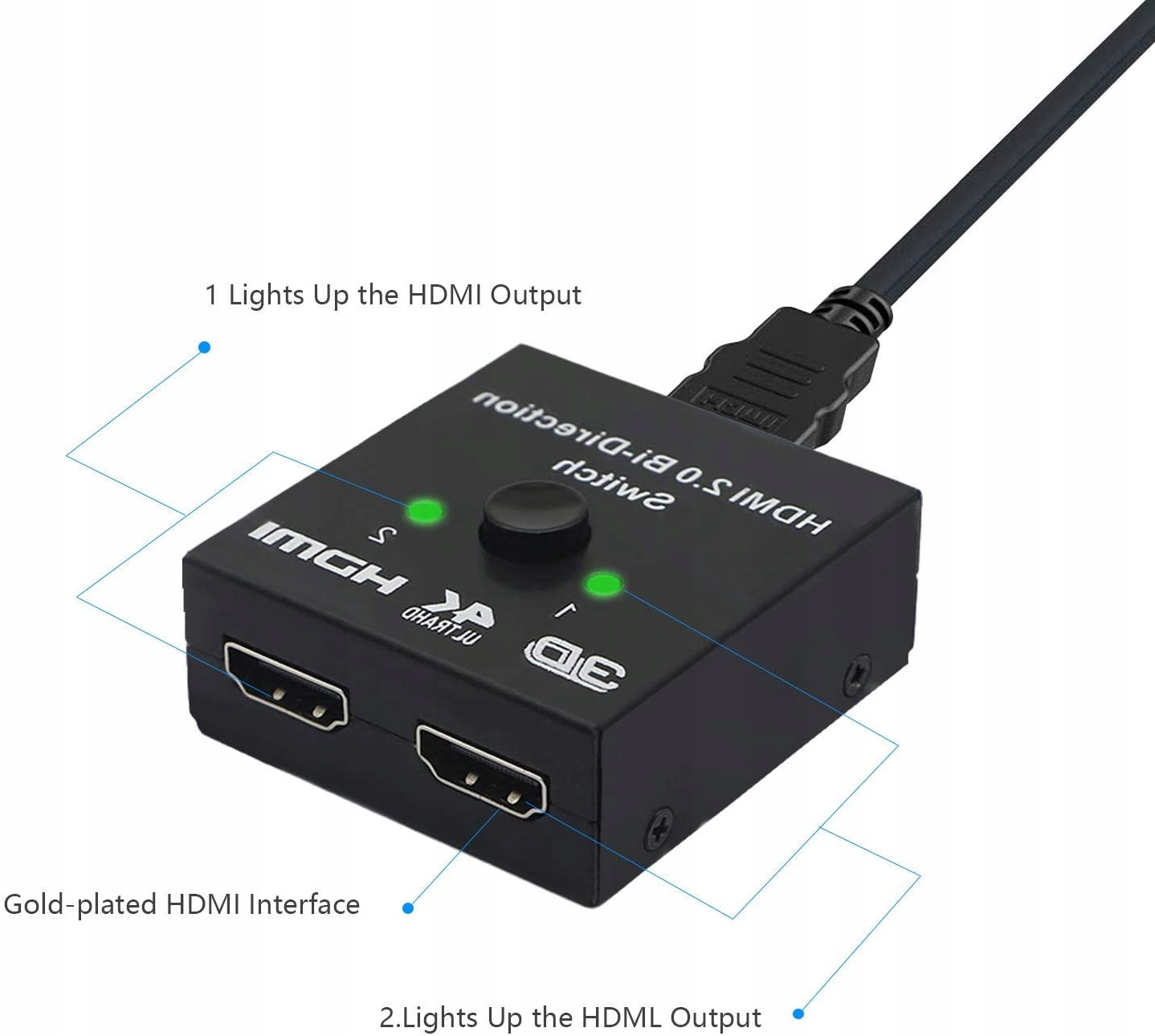 - PLUG AND PLAY — внешний драйвер или питание не требуется, переключатель HDMI будет работать после подключения. Просто нажмите кнопку, чтобы изменить источник входного или выходного сигнала, и светодиодный индикатор покажет, какой порт активен.
