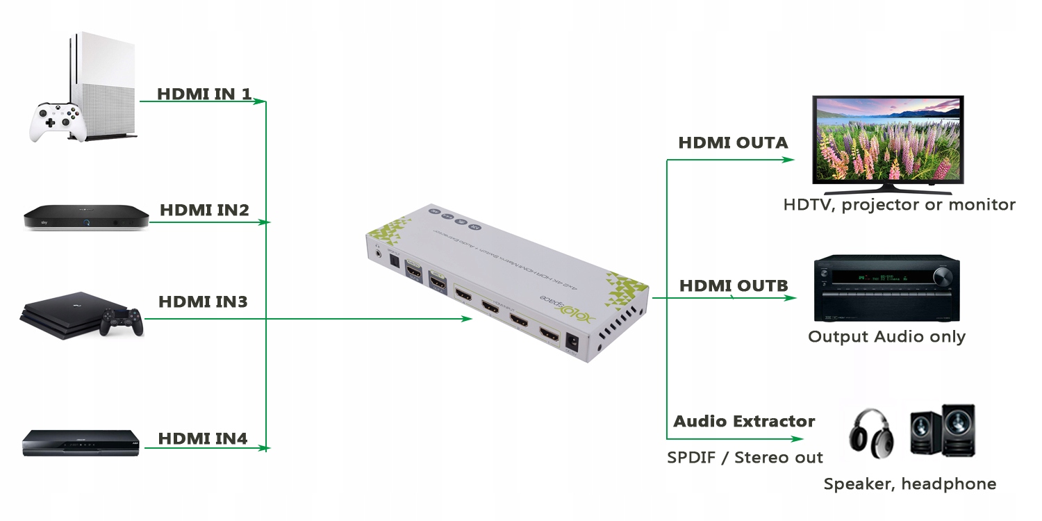 Матрица XOLORSpace ® HDMI 4x1 может перенаправить четыре входа на один выход (например, телевизор, проектор, монитор) . Дополнительно звук выводится на разъем HDMI B. Второй выход HDMI работает в асинхронном режиме. Подключаем телевизор к выходу А, а звуковое устройство (усилитель, саундбар и т. д.) к выходу Б через HDMI. Не имеет значения, что ресивер не поддерживает изображение HDCP 2.2 или 4K. На разъем B передается только звук. Это позволяет использовать старые аудиоустройства с новейшими телевизорами 4K HDR и наслаждаться многоканальным звуком HD, например Dolby TrueHD. Переключение входных сигналов на выходы осуществляется с помощью пульта ДУ или кнопок на устройстве. Текущее состояние отображается тонкими светодиодами. Интегрированный усилитель обеспечивает захватывающее дух изображение. Кроме того, аудиосигнал может воспроизводиться параллельно через цифровой оптический разъем Toslink и мини-разъем 3,5 мм. Встроенный аудиоконтроллер EDID позволяет вам определить формат вывода звука для разъема SPDIF. Вы можете установить звук 2.0 или 5.1.