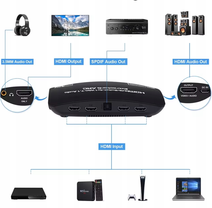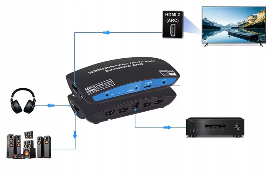 Благодаря функции извлечения HDMI устройство позволяет извлекать звук из сигнала HDMI в аудио HDMI 7.1 Atmos, стереозвук 3,5 мм и Toslink SPDIF. оптический звук. Кроме того, аудиоэкстрактор поддерживает HDMI ARC (обратный аудиоканал).