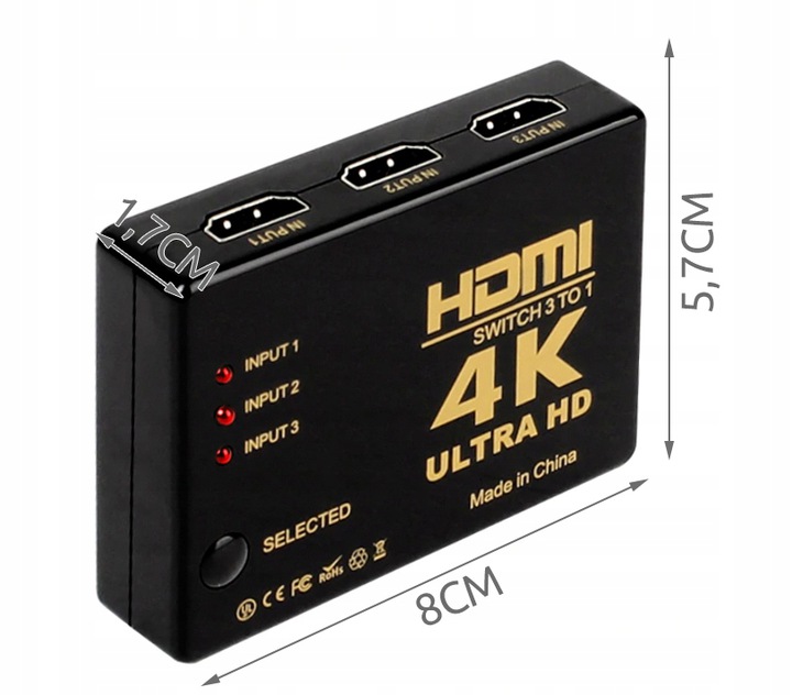 - Преобразование без потери качества - дистрибьютор укрепляет передаваемый сигнал и не теряет качества. Он совместим с каждым устройством с разъемом HDMI . Switch не требует установки дополнительных драйверов , вам нужно только подключить кабели, и продукт готов к использованию. Для подключения 3 устройств - b> переключатель позволяет подключить 3 устройства к одному розетку HDMI на телевизоре или мониторе - вам не нужно раскрутить кабель, чтобы включить устройство, например, ноутбук, DVD, декодер , Консоль и т. Д. Первым из них является Intellent , после подключения источника/его переключения (источник питания должен быть включен), сам переключатель автоматически выберет этот источник. Когда вы выключите/отключаете источник переключателя самостоятельно, вы выберете еще один включенный источник. Второй режим - Руководство , он позволяет вам вручную выбрать кнопку «Выбранный» на дистрибьюторе или пульте дистанционного управления. - был прикреплен пульт дистанционного управления с ИК -датчиком. Это обеспечивает удобное переключение между портами. Например, вам не нужно вставать с дивана, чтобы переключить заданный порт - все, что вам нужно сделать, это использовать пульт дистанционного управления!