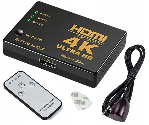 Современные модели телевизоров и мониторов оснащены портами HDMI, но очень часто их количество недостаточно для подключения всех необходимых устройств и аксессуаров. Полем Это позволяет подключать 3 устройства одновременно - вам не нужно отдохнуть кабель, чтобы подключить новое устройство. Вы постоянно подключаете 3 источника сигналов, , например, Ноутбук, DVD, декодер, консоль и т. Д., А затем с помощью пульта дистанционного управления (или переключения) вы переключаете, с какого устройства вы хотите посмотреть сигнал на телевизоре > В набор включен дистрибьютор, дистанционное управление дистанционным управлением, ИК -датчик, подключенный к коммутатору и USB -кабелю. Дополнительное гаджет, который облегчает использование, - это светодиоды, сигнализирующие с подключенным оборудованием