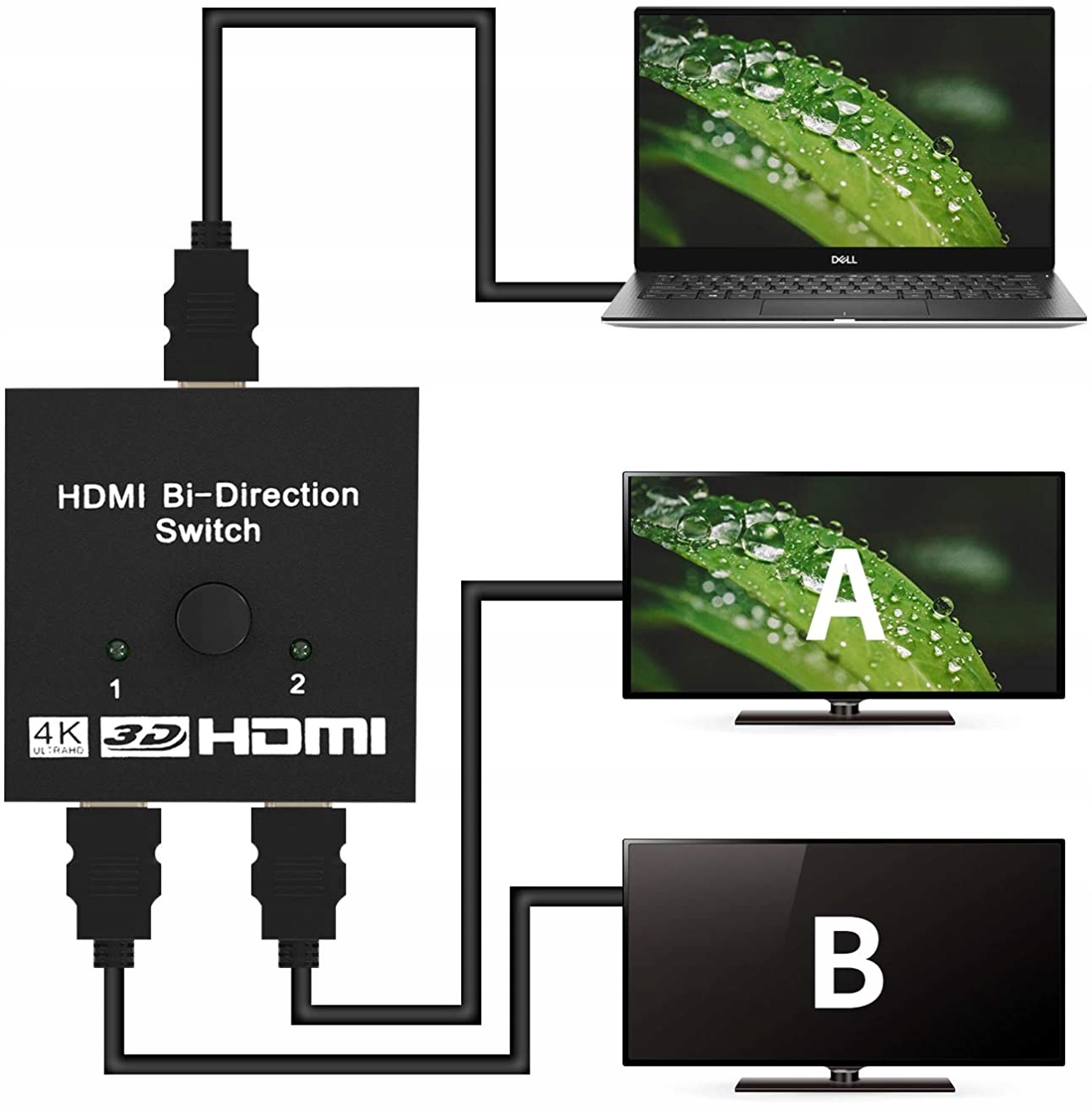 Адаптер позволяет подключить 2 устройства (например, ноутбук, приставку, консоль), оснащенные выходом HDMI, к устройству (например, телевизору, монитору, проектору) с разъемом HDMI