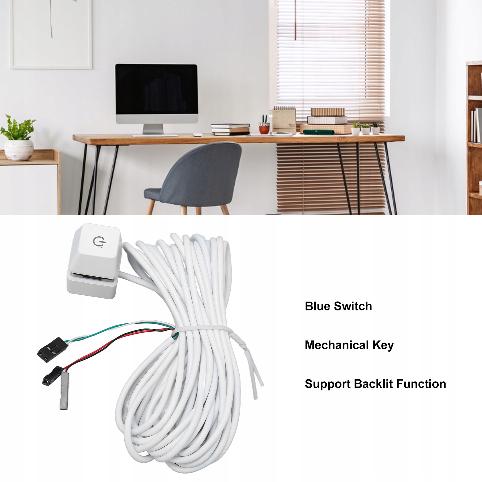- Тип переключателя: механическая кнопка с синим переключателем (подсветка).