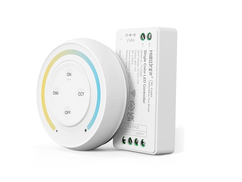 Комплект, состоящий из контроллера и радиопульта, позволяет управлять одноцветной светодиодной лентой с помощью пульта дистанционного управления. Контроллер, рассчитанный на питание от постоянного тока 12 В или 24 В, устанавливается между источником питания и светодиодной лентой. Радиопульт позволяет управлять светодиодной лентой на расстоянии до 20 метров от контроллера.
