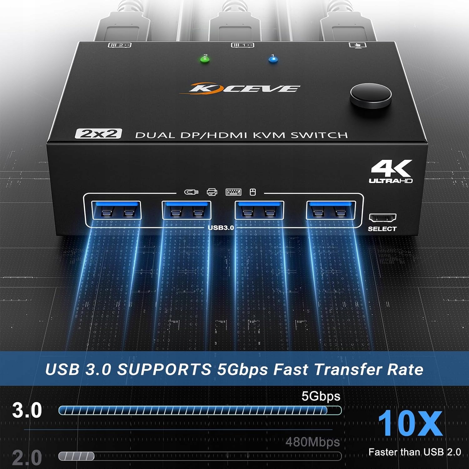 KVM-переключатель Порт USB 3.0 Displayport + HDMI, KVM-переключатель с двумя мониторами 4K при 60 Гц, KVM-переключатель 2 ПК 2 Монитор с 4 портами USB 3.0 для 2 компьютеров с общей мышью, клавиатурой и монитором.