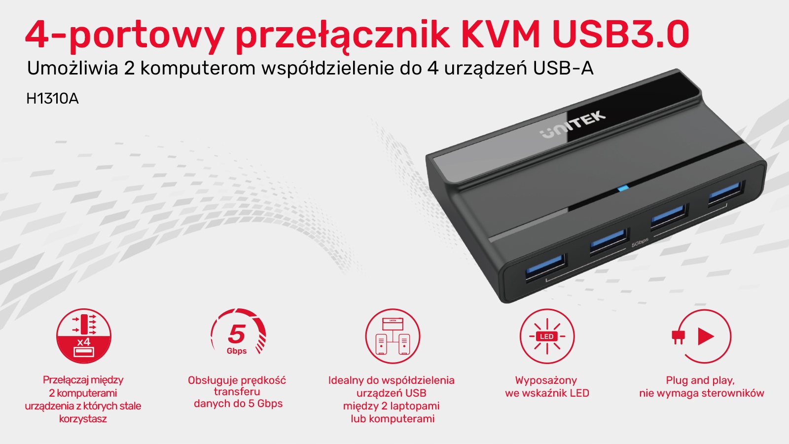 Перемикач KVM Unitek H1310A 4x USB 5Gbps активний