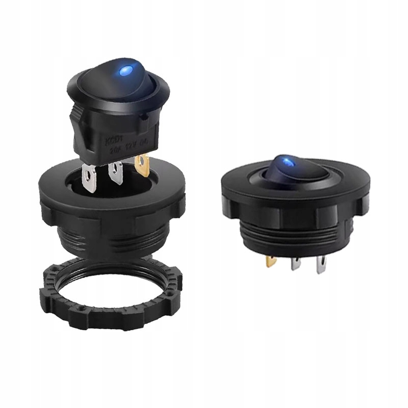 Электрический выключатель ВКЛ-ВЫКЛ, подсвеченный синим светодиодом. Помещен в рамку с монтажным диаметром 28мм. Идеально подходит для распределительных щитов яхт и каркасов электрических панелей. В комплект входят клеммные заглушки.