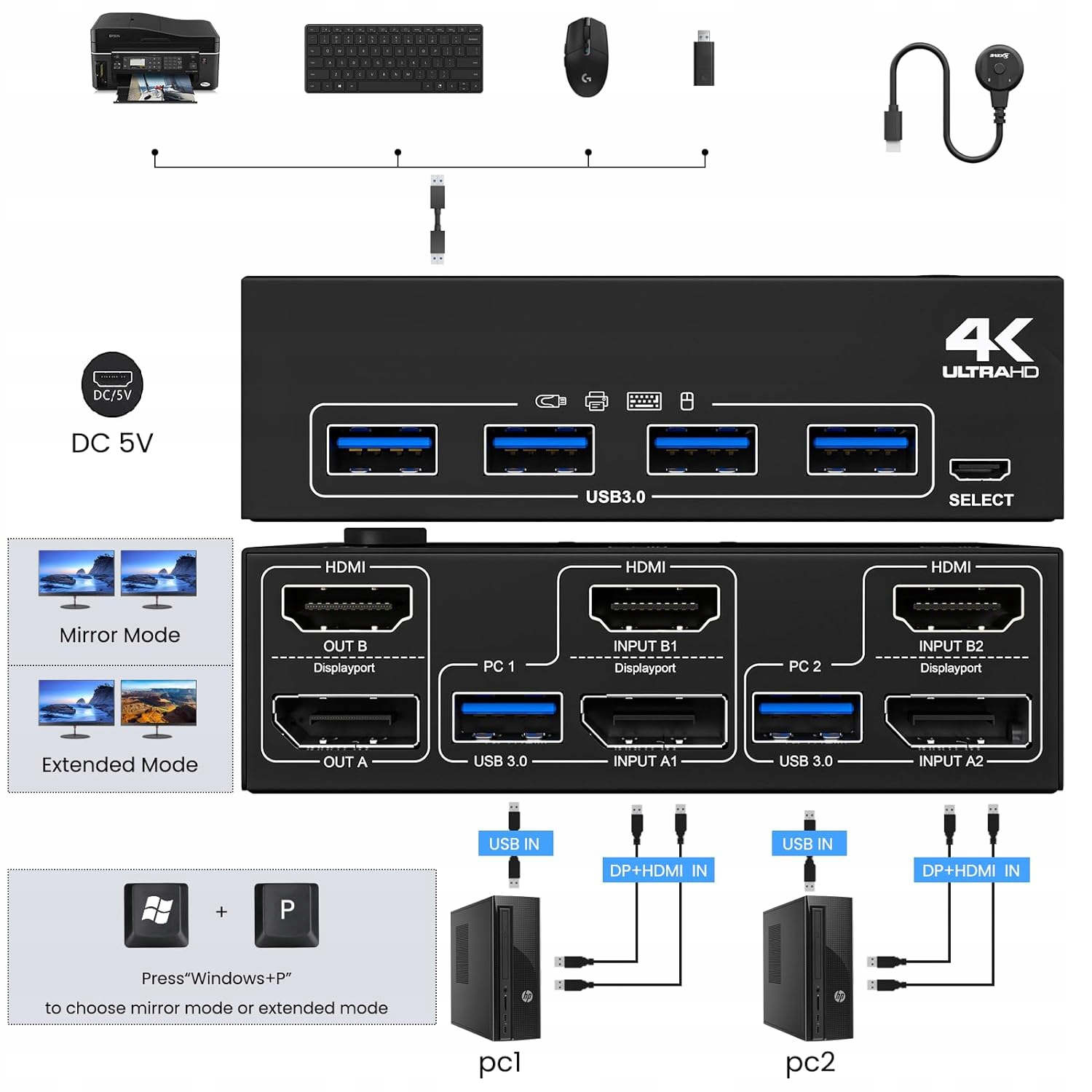 kvm switch hdmi + dp 2 порты Это USB 3,0 квм 2 DisplayPort + HDMI -порты очень подходят для устройств с интерфейсами DP и HDMI, понимая, что 2 компьютера имеют набор мыши, клавиатуры и мониторов. Нажмите «Windows+P», чтобы Dual Monitore Switch KVM USB 3.0 может выбрать поддержку экрана зеркала или расширенного экрана дисплея. Вывод видео на экране с интерфейсом DP и HDMI. Каждый компьютер требует 1 HDMI + 1 DP + 1 USB -кабель для подключения к переключателю KVM.