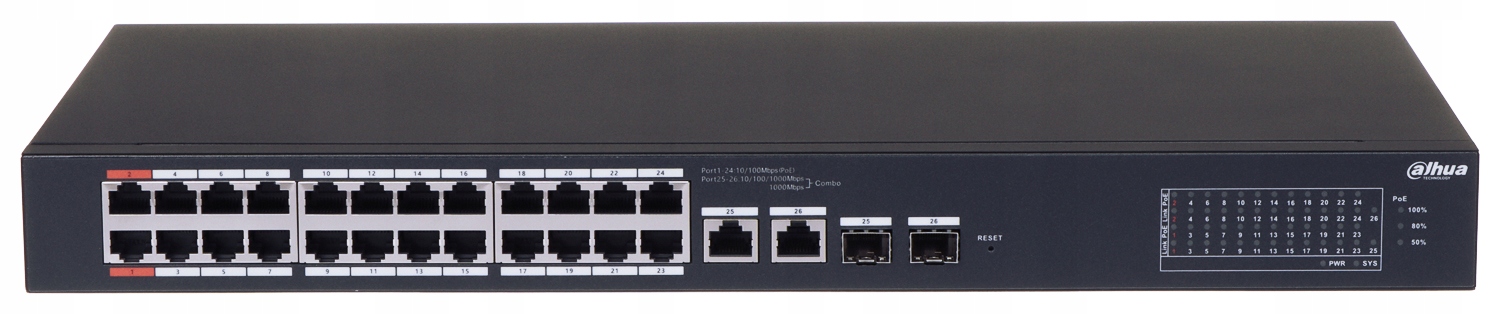 10 /100 МБ / с: 24 локальные и Порты По, 10/100/1000: 2 порта RJ45 (Upplink), 1000: 2 порта SFP (uplink)