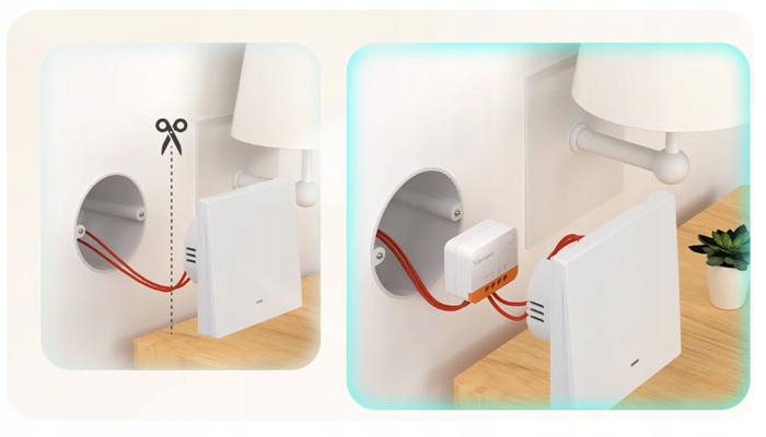 Sonoff Smart Switch отличается небольшими размерами, а это значит, что его можно монтировать в различные монтажные коробки, даже самые маленькие - EU/86/120. Кроме того, он работает с различными типами внешних переключателей, например, кулисным переключателем или настенным переключателем с кнопками. Устройство Sonoff также легко устанавливается и не требует нейтрального провода.