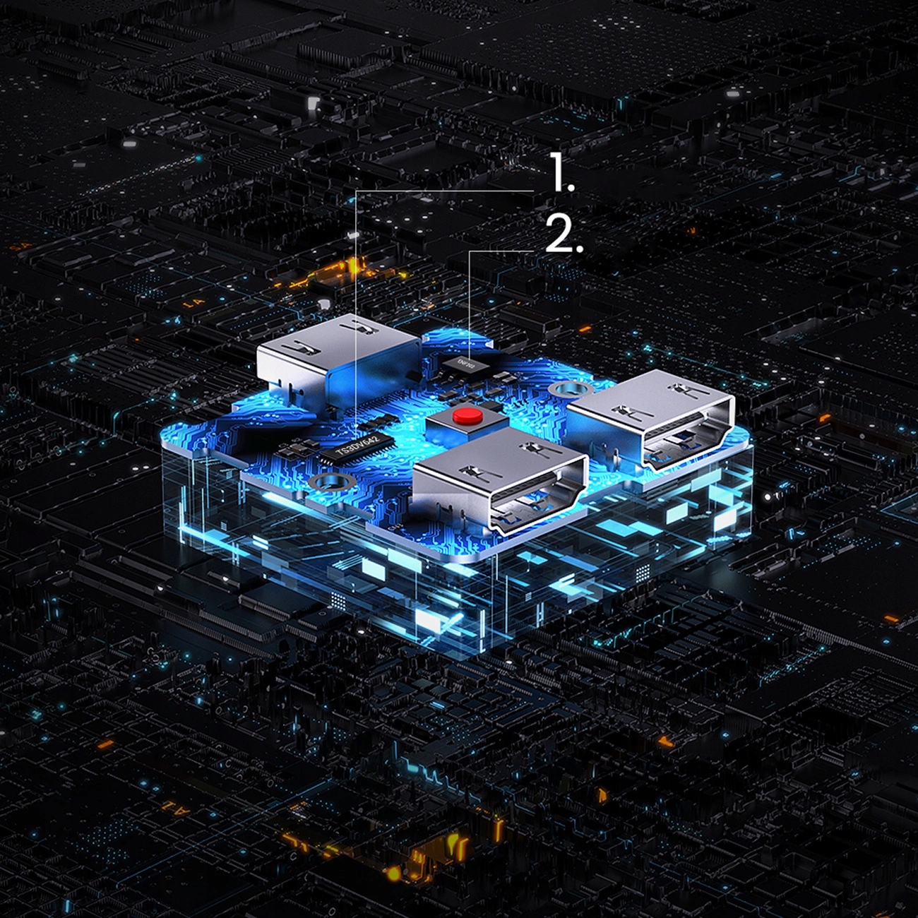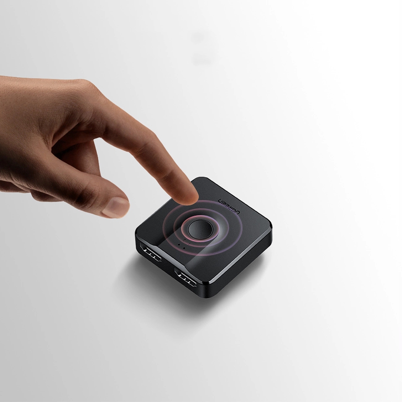Коммутатор оснащен двумя входными портами и одним выходным портом. Верхняя кнопка позволяет легко переключаться между розетками. Источник сигнала отмечен светящимся номером, расположенным на передней панели устройства. После включения или подключения источника изображения просто нажмите кнопку, и сплиттер переключится на это устройство.
