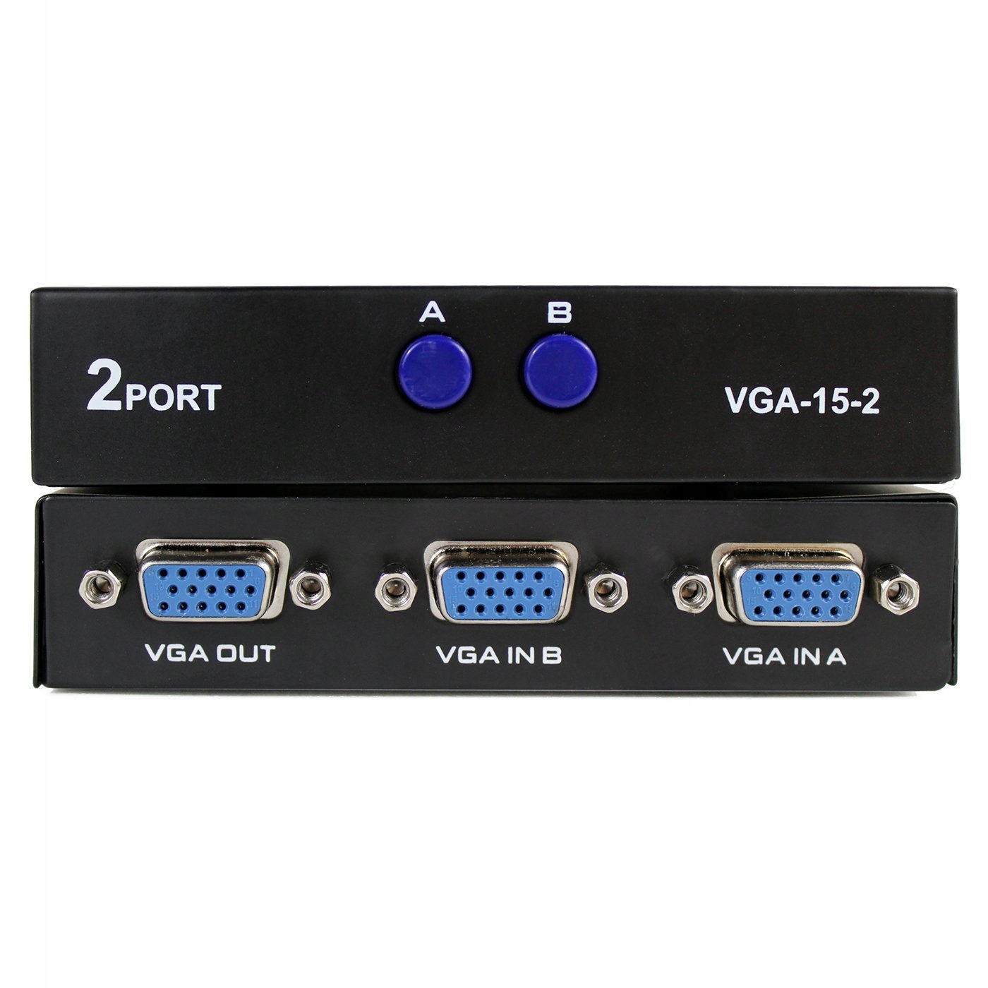 Switch VGA 2 x 1 – высококачественный продукт, позволяющий подключить 2 компьютера к одному монитору или разделить сигнал VGA на 2 внешних ресивера и просматривать изображение не одновременно на 2 мониторах.