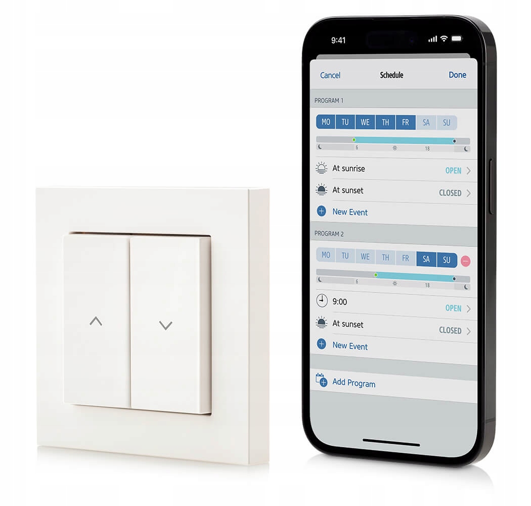 Установите график так, чтобы ролик автоматически поднимался и понижался в соответствии с вашим ритмом дня. Например, вы можете решить, что слепой должен подняться на рассвете, чтобы солнечные лучи пробудили вас, но только в будние дни. Вечером слепой может уйти в выбранное время, даже если вас нет дома. Это решение не только обеспечивает большее удобство, но и пугает потенциальных воров. Все графики сохраняются и хранятся непосредственно в контроллере, поэтому Eve Shutter Switch может работать независимо от Home Hub, iPhone и подключения к Интернету.