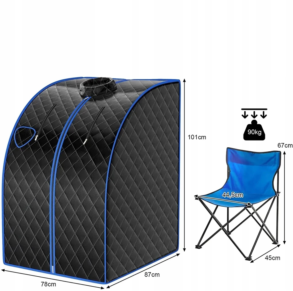Переносная паровая сауна изготовлена из водонепроницаемой алюминиево-полимерной ткани, что обеспечивает легкую очистку и хорошее сохранение температуры. Два отверстия на молнии освобождают руки во время пребывания в сауне. Благодаря 9 уровням настройки температуры (максимум 64°C) и 9 вариантам таймера (15–90 минут) вы можете настроить ее в соответствии с вашими потребностями с помощью пульта дистанционного управления. Благодаря закаленному стеклу и крышке из нержавеющей стали он прекрасно сохраняет температуру и повышает безопасность использования. Контейнер для трав позволяет усилить эффект детоксикации во время использования. Впитывающий коврик предотвращает скопление большого количества воды на полу. В комплект также входит кресло, обеспечивающее комфортное сидение.