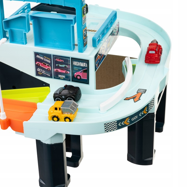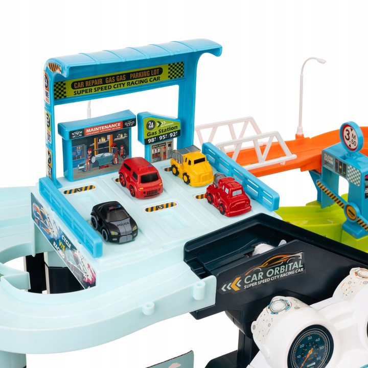 Уникальный дизайн трека позволяет создавать свои собственные пути и сценарии. Благодаря электрическому лифту, интерактивному рулевому колесу со звуками и световыми эффектами, а также станции газа и ремонта, ваш ребенок может испытать незабываемые приключения в мире автомобилей.