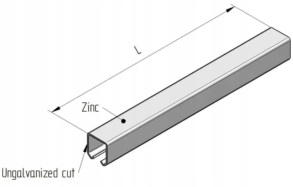 Рельс стальной оцинкованный (С-образного сечения) длиной 2000 мм для подвесных ворот. Наружное сечение: 33х34 мм, сечение стены - 2 мм. С-образное сечение используется как элемент конструкции, по которому перемещаются верхние ролики или тележки для подвесных ворот.