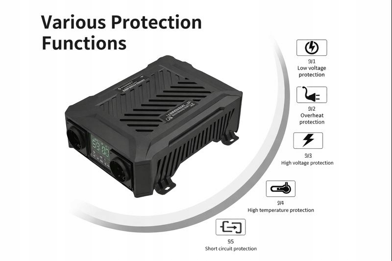 Высококачественный преобразователь напряжения чистой синусоидальной формы, предназначенный для преобразования постоянного тока 12 В постоянного тока от аккумулятора в переменный ток 230 В переменного тока (220–240 В, 50 Гц). Обеспечивает стабильное и безопасное питание даже для чувствительной электроники.