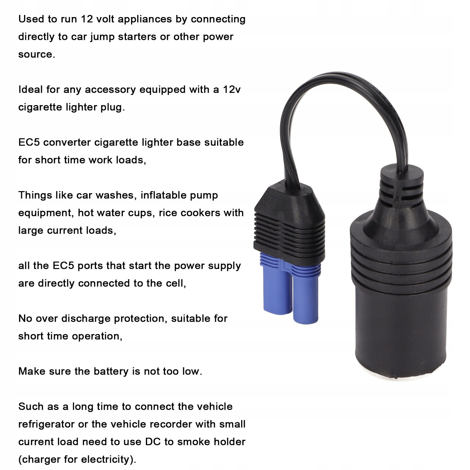- Параметр: основание прикуривателя EC5 подходит для кратковременных нагрузок, таких как автомойка, насос для зарядки воздуха, чашка с горячей водой, рисоварка с большой токовой нагрузкой, поскольку все порты EC5 напрямую подключены к электрическому сердечнику, нет защиты от переразряда, подходит для кратковременной работы, небрежно обращайте внимание на не слишком низкую мощность. При длительном подключении к автомобильному холодильнику или регистратору данных автомобиля слаботочную нагрузку следует перевести на дымодержатель постоянного тока (зарядное устройство)