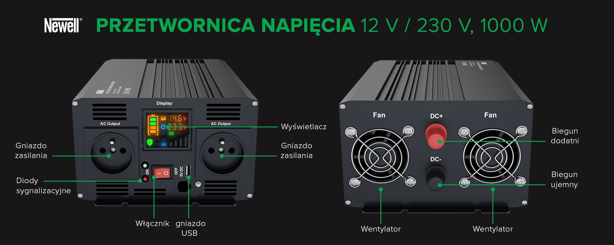 - модель: преобразователь напряжения Newell с чистой синусоидой - 12 В/230 В, 1000 Вт