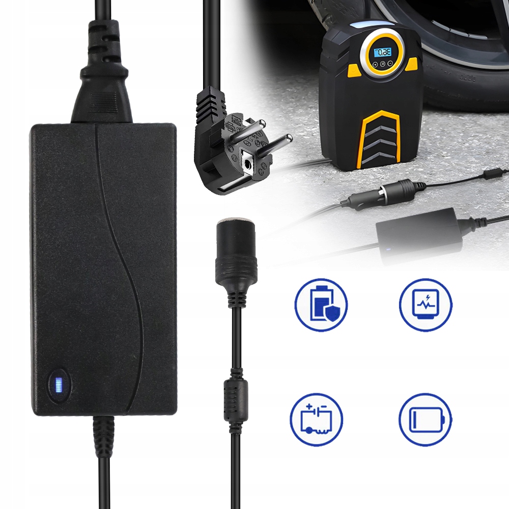 - Автомобильный блок питания преобразует переменный ток 100-240 В (ток из домашней сети) в постоянный ток 12 В 5 А (от гнезда прикуривателя автомобиля)на выходе 60 Вт.