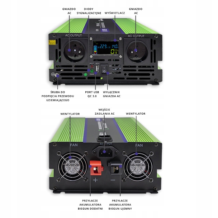 Преобразователь марки Qoltec имеет чистый синус, он выдает такой же ток, как и в розетке 230В, обеспечивая безопасность всех подключенных устройств. Он будет идеален как при отключении электроэнергии, так и во время путешествия, когда у нас нет доступа к розетке.